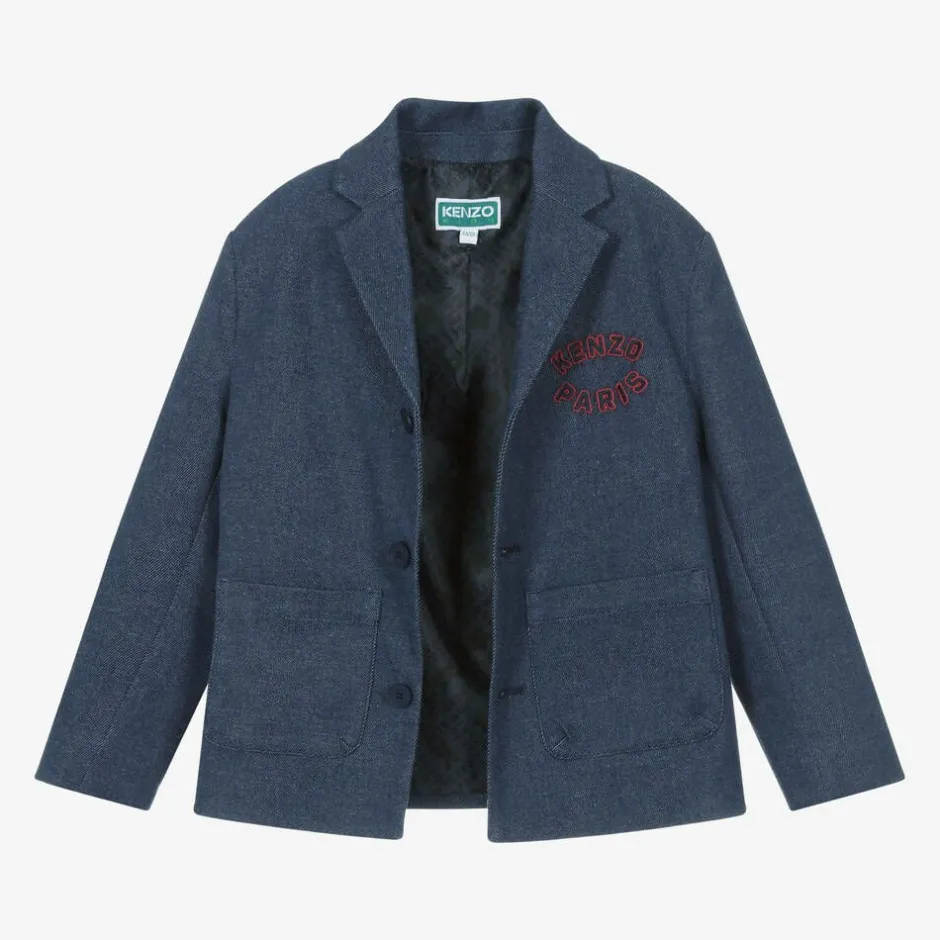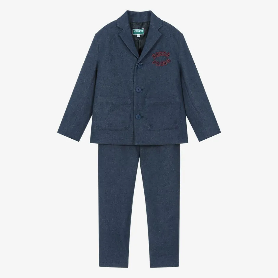 Dark blue denim suit for boys by French designer KENZO KIDS, made in a cotton blend with a touch of stretch. Lined with branded fabric, the button-up blazer has a single-breasted silhouette with buttoned cuffs and two front pockets. Kenzo Paris is embroidered on the chest, notably outlined in red for impact. The same lettering can be seen on the back, with a navy blue Eiffel Tower symbol. The trousers have a matching embroidered logo, an elasticated waistband for comfort and front and back pockets.
