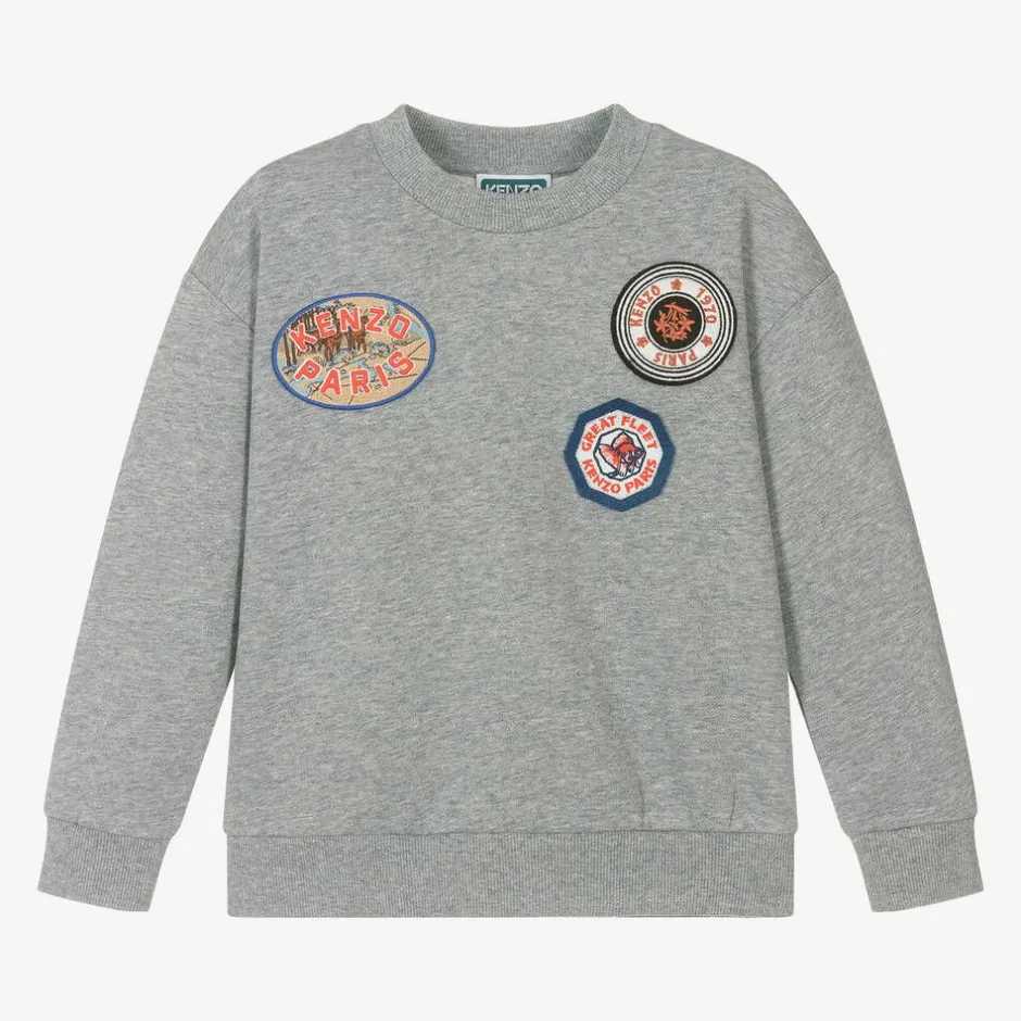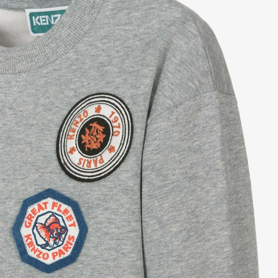 Grey marl sweatshirt for boys by French brand KENZO KIDS, made in a mid-weight cotton jersey blend. For instant brand recognition, it has travel-inspired logo patches on the front and a red bouclé logo on the back. It has a warm, fleecy inside and long sleeves with cosy ribbed cuffs.