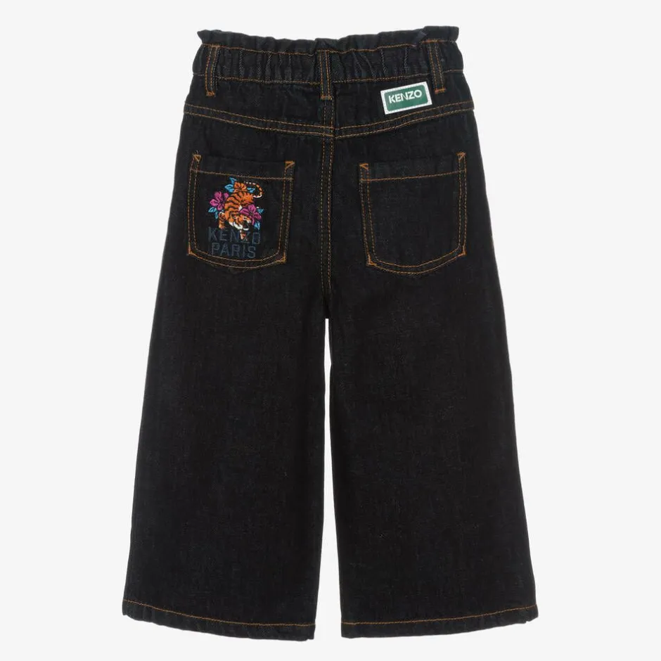 Wide leg jeans for girls by KENZO KIDS, in dark blue cotton denim. They have an elasticated waistband, a decorative gold button and mustard yellow topstitching for an authentic look. Pleats below the waistband give the jeans a more tailored appearance. A cartoon-style tiger and Kenzo Paris embroidery on the back pocket adds distinctive designer detailing.