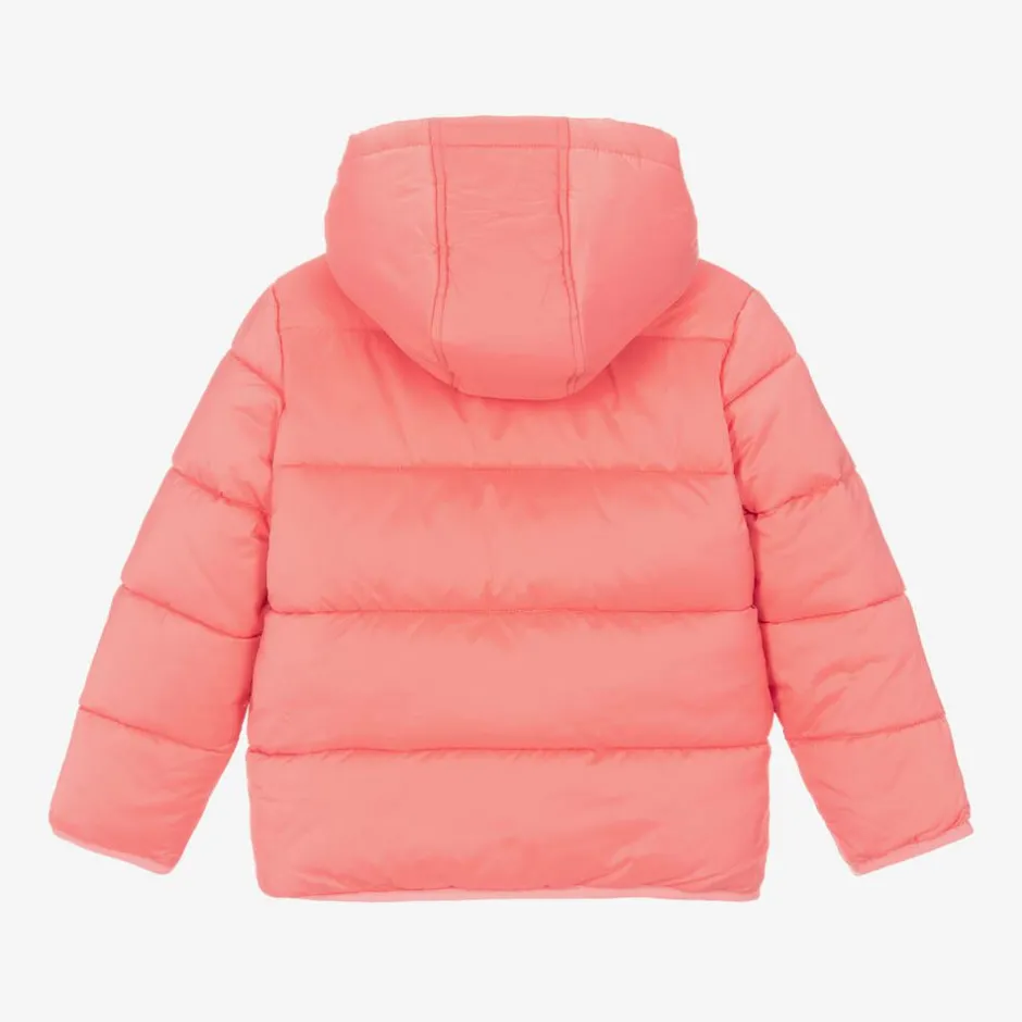 This coral pink hooded puffer coat for girls is by luxury French brand KENZO KIDS. For instant designer appeal, it has the iconic Elephant logo badge embroidered on the front in grey and red. Warmly padded and water repellent, it has side seam pockets and a branded zip fastening on the front. It is fully lined in satin for comfort.