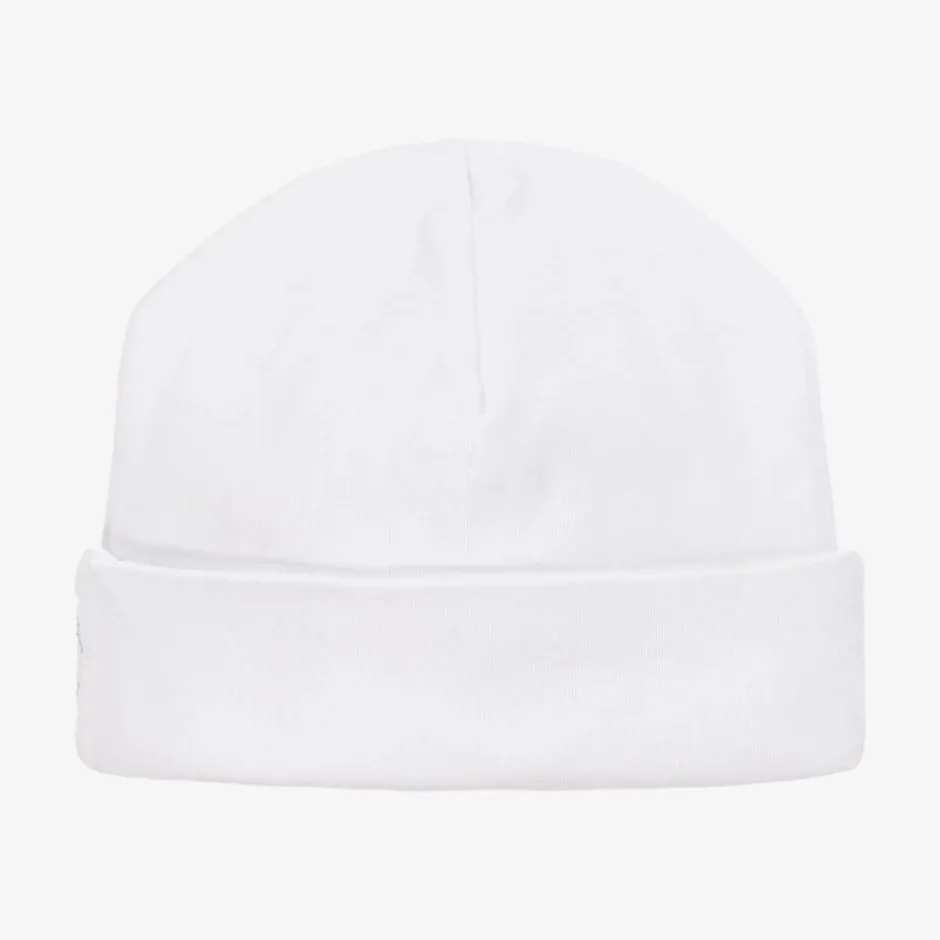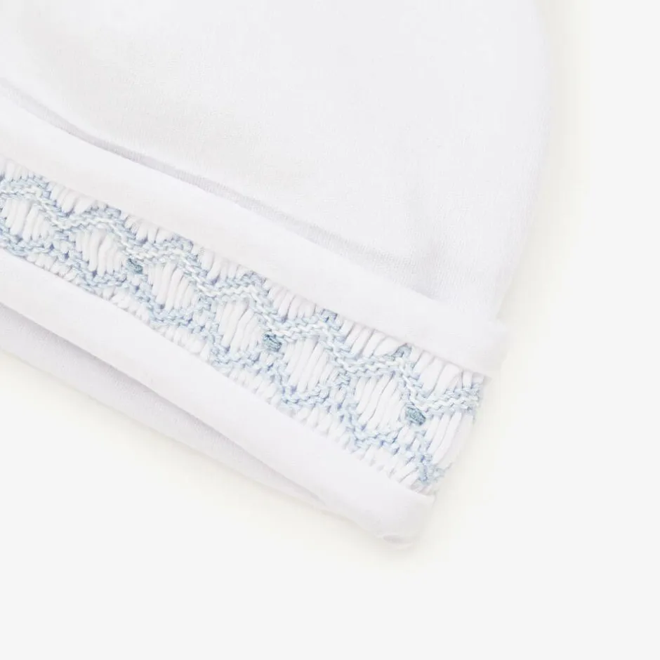 White layette hat for baby boys by Kissy Kissy, with hand-smocked trim for a traditional look. It is made in a double layer of super soft Pima cotton jersey for a gentle feel on the skin.