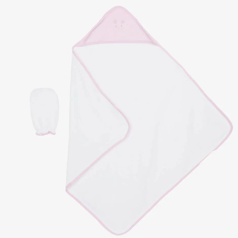 White cotton hooded towel and mitt set for baby girls by Kissy Kissy. Made in beautifully soft towelling, it has a pale pink jersey hood with an embroidered bear face, and matching trim. Ideal for bath time, it comes with a soft white mitt that has an elasticated, frilled cuff.