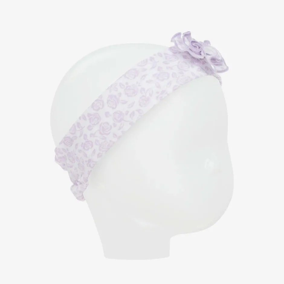 A sweet headband for baby girls by Kissy Kissy, patterned in lilac purple flowers on a white background. Gently elasticated at the back, it is made in super soft Pima cotton jersey, with a pretty ruffle flower decoration on the front.