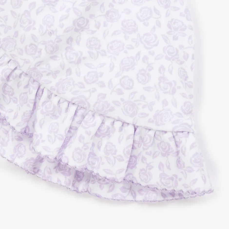A pretty sun hat for baby girls by Kissy Kissy, patterned in lilac purple flowers on a white background. Made in a double layer of super soft Pima cotton jersey, it has a frilly brim with picot embroidery trim.