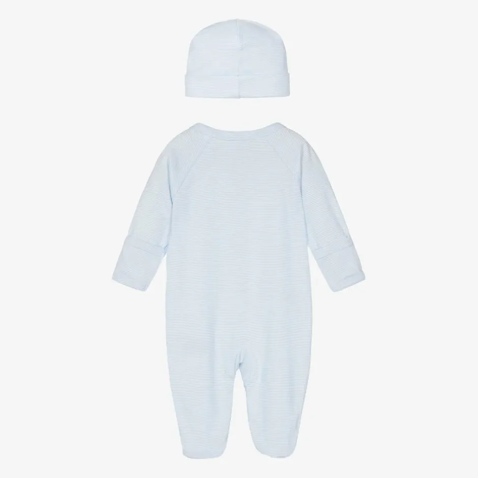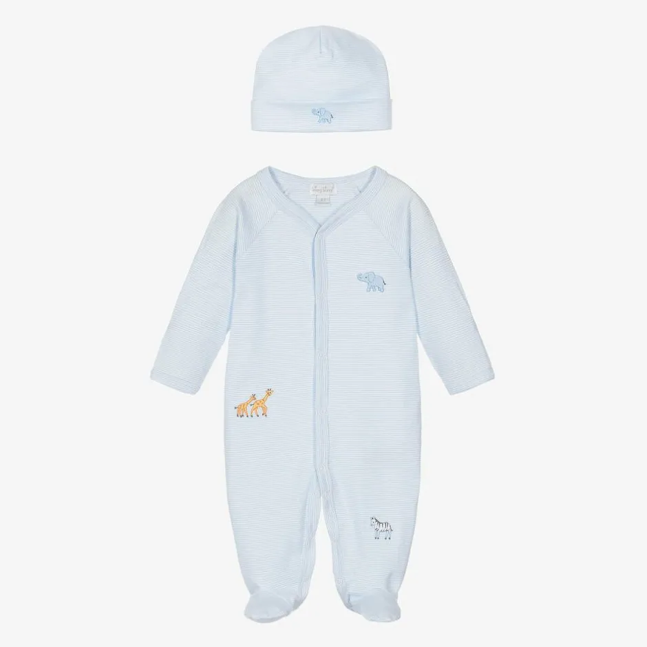 Blue and white stripe babygrow and hat set for boys by Kissy Kissy, made in super-soft Pima cotton jersey. Inspired by the jungle, this adorable set is decorated with giraffes, elephants and zebras embroidered in muted colours. The hat has a fold-over brim and the babygrow fastens with poppers on the front and between baby's legs. Smaller sizes are designed with fold-over scratch mitts on the cuffs to help protect delicate skin.