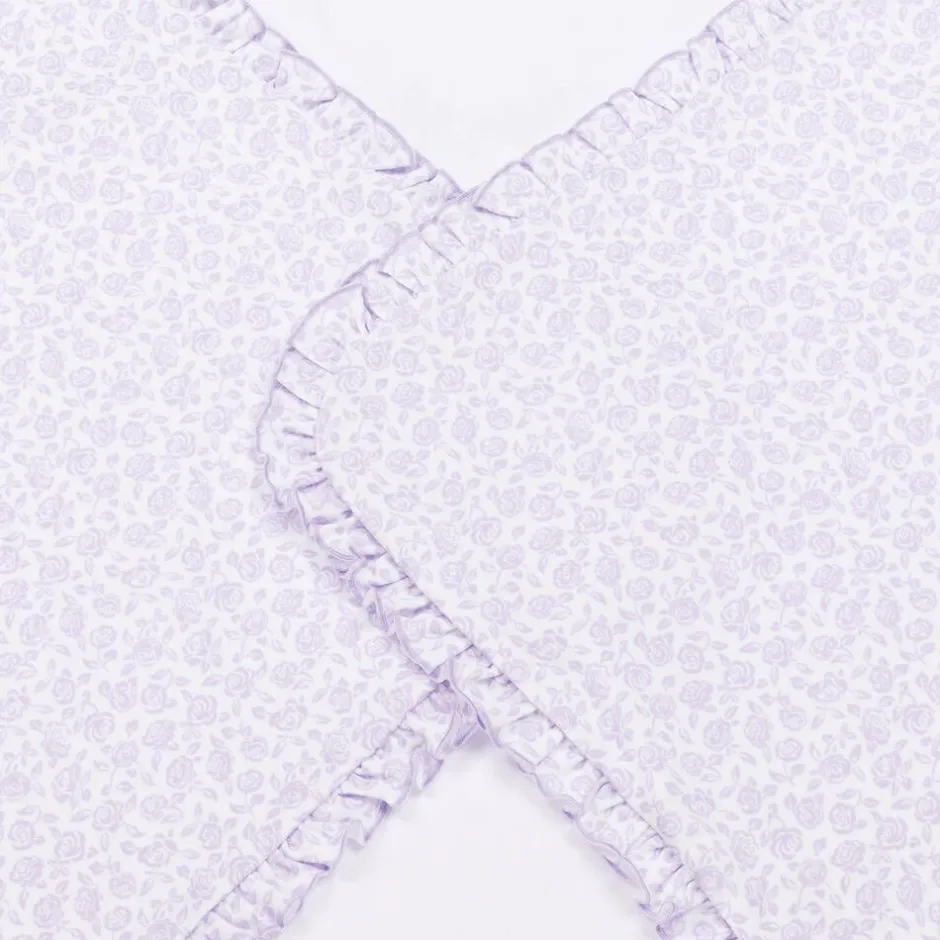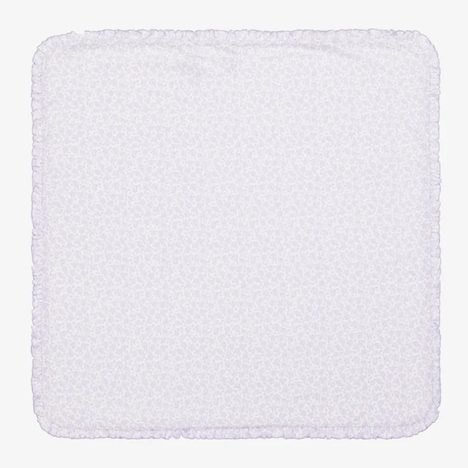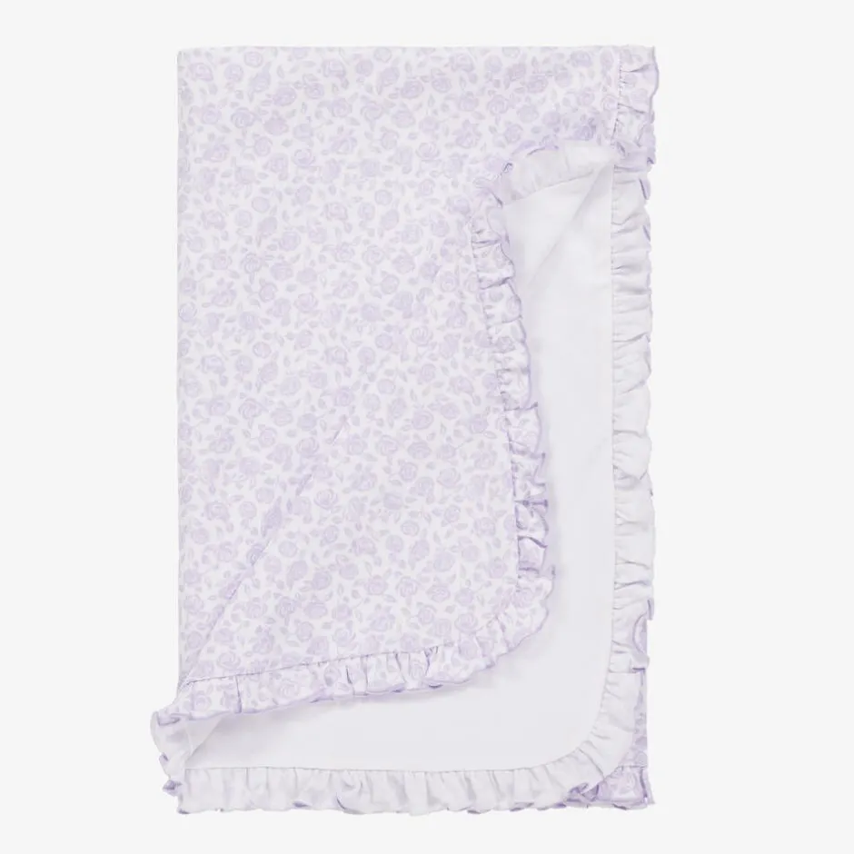 Sweet blanket for baby girls by Kissy Kissy, made in a double layer of soft and stretchy Pima cotton jersey. The front is patterned with a lilac purple floral design and has a pretty ruffle trim around the edges. The reverse is plain white. This lovely accessory is ideal for use in the nursery or when out and about in the pram or car seat.