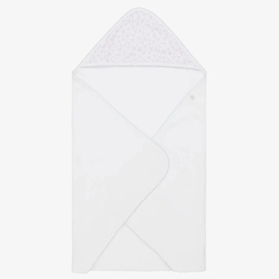 White hooded towel and mitt set for baby girls by Kissy Kissy. Soft and fluffy and ideal for bath time, both pieces are made in absorbent cotton towelling, with purple picot trims. The hood of the towel is trimmed in super soft cotton jersey, patterned with a pretty purple floral print.