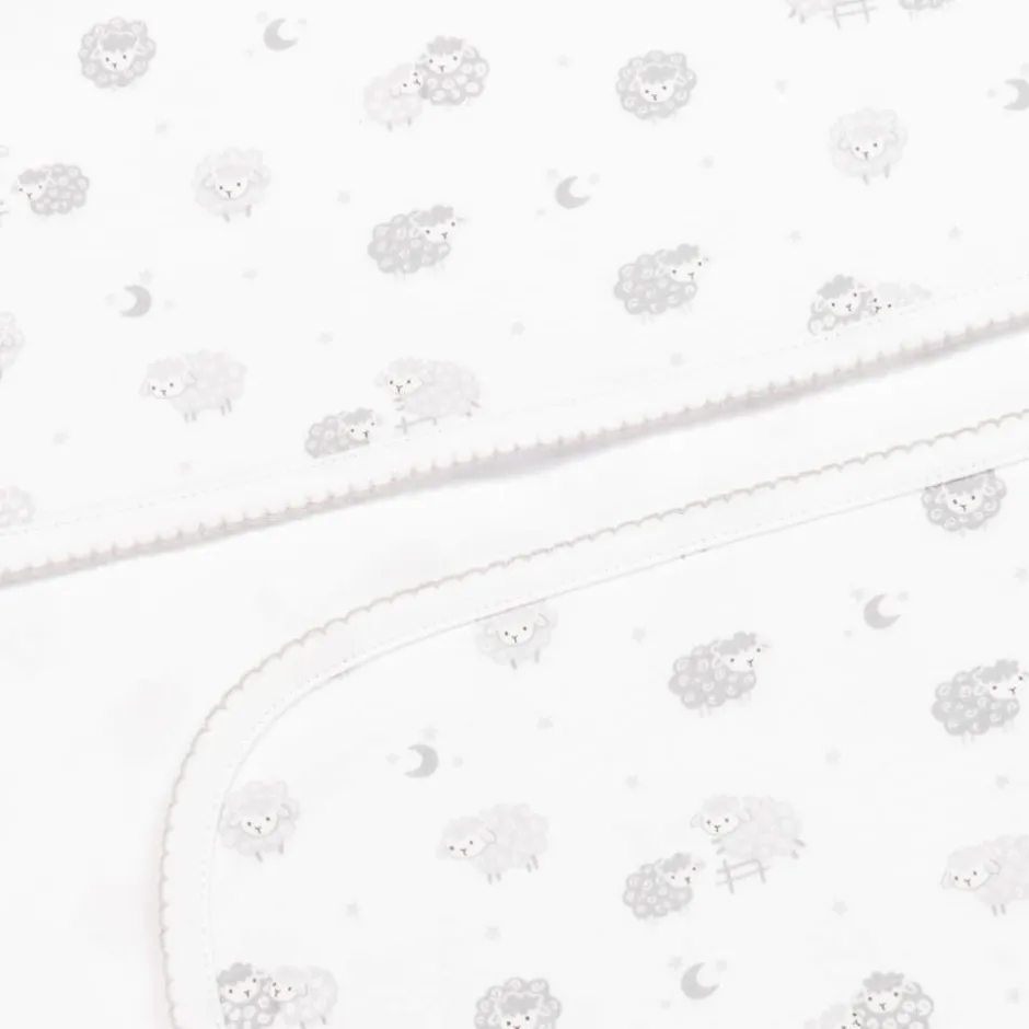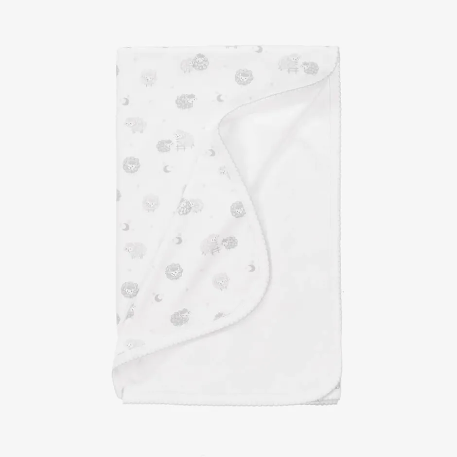 White blanket for baby boys and girls by Kissy Kissy, made in a double layer of soft, stretchy Pima cotton jersey. One side has a cute grey sheep pattern with grey picot trims. The reverse is plain white. This lovely accessory is ideal for use in the nursery or when out and about in the pram or car seat.