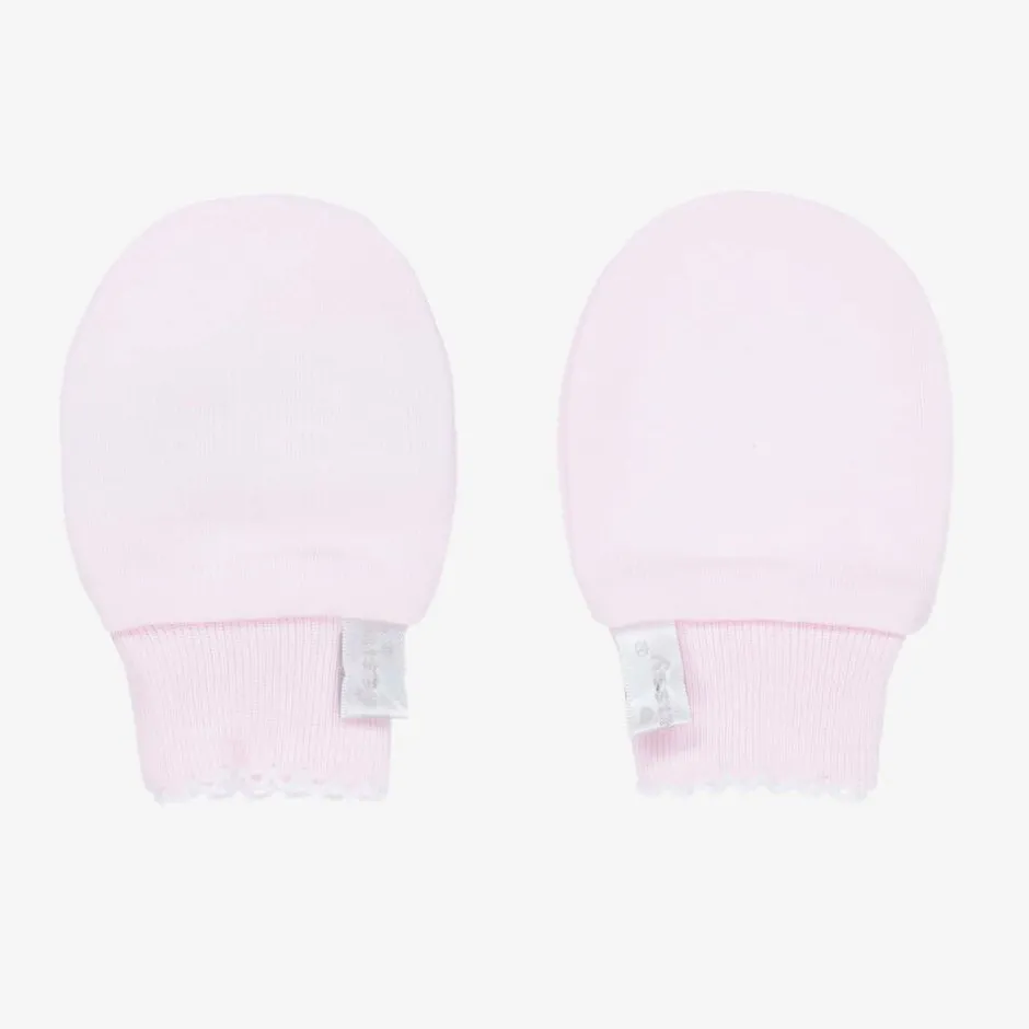A pair of pale pink scratch mittens for baby girls, by Kissy Kissy. Soft and stretchy, they are made in comfortable Pima cotton jersey, ideal for delicate skin. They have white picot trim and ribbed cuffs, so they stay securely on little hands.