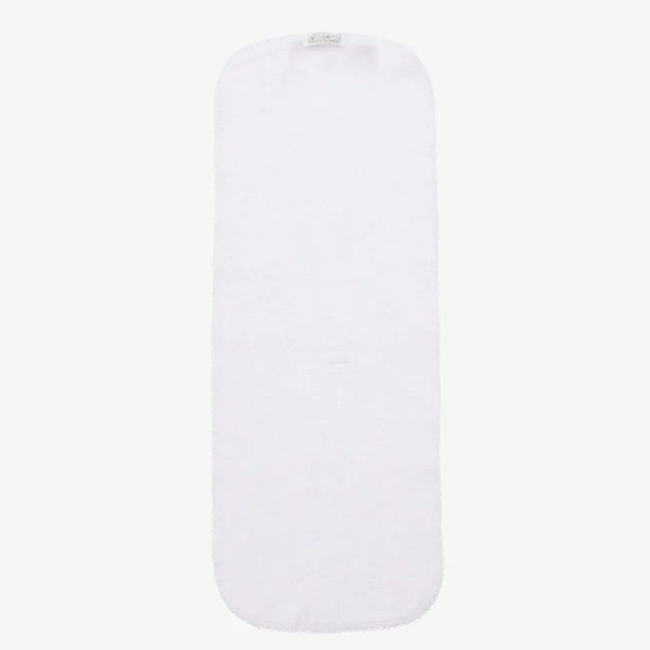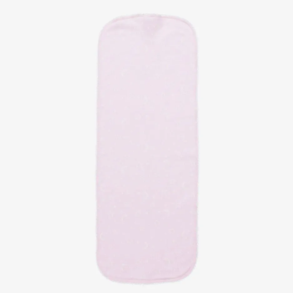 A lovely pale pink burp cloth for baby girls by Kissy Kissy, patterned with white crescent moons and stars. It is made in super soft Pima cotton jersey with an absorbent cotton towelling backing and white picot trim. It is ideal for draping over the shoulder when burping your baby and for wiping those little spills at feeding time.