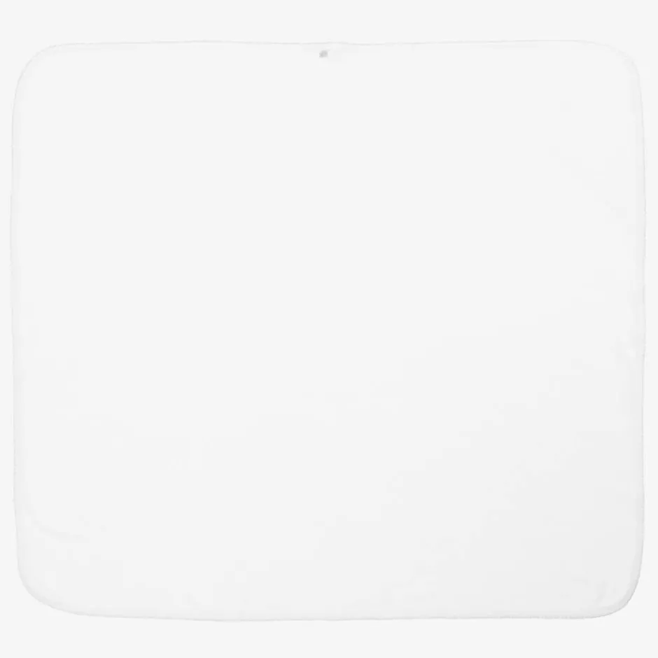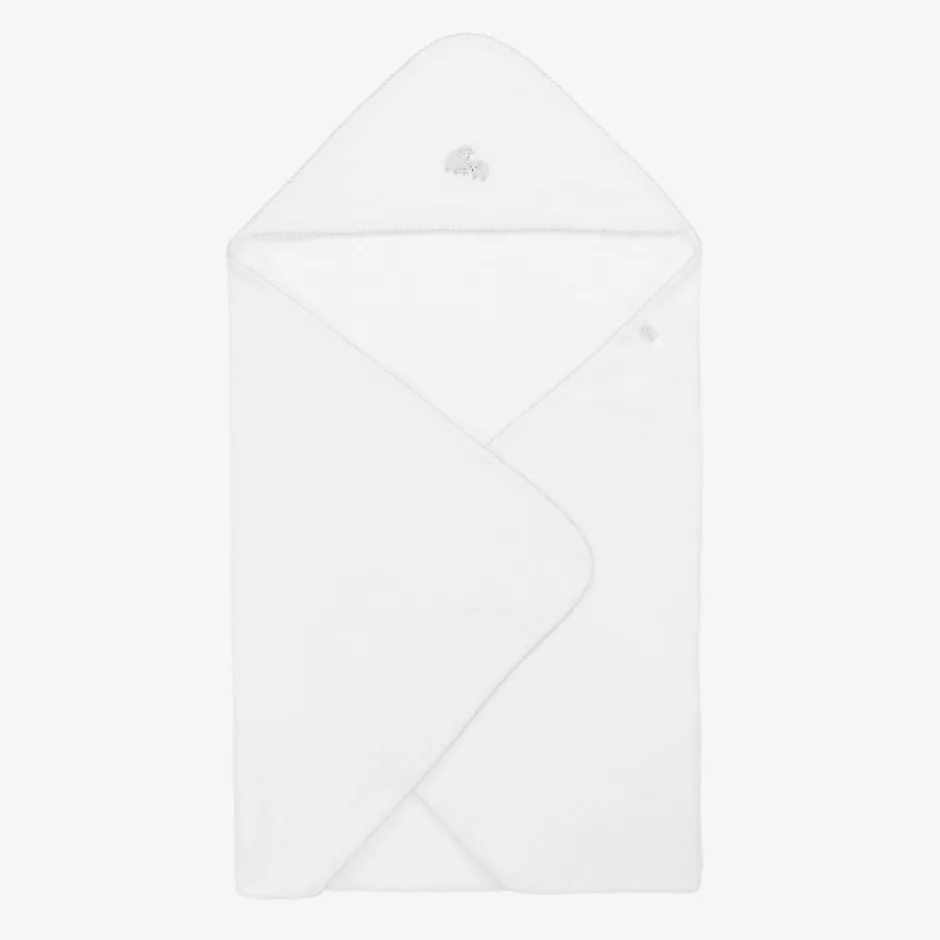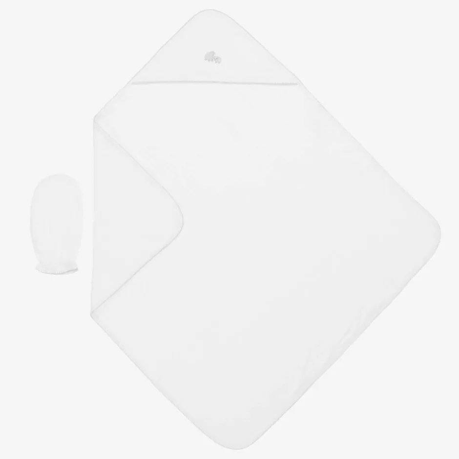 White hooded towel and mitt set for baby boys and girls by Kissy Kissy. Soft, fluffy and ideal for bath time, both pieces are made in absorbent cotton towelling, with grey picot trims. The hood of the towel is trimmed in super soft cotton jersey and has a cute embroidered grey sheep.