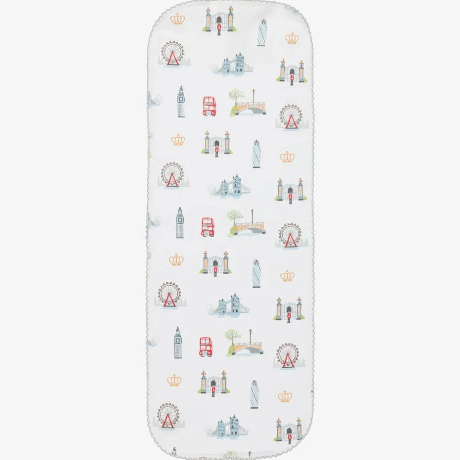 White burping cloth for baby boys and girls by Kissy Kissy, made in super soft and stretchy Pima cotton jersey. In shades of red, blue and beige, the London-themed print features iconic symbols and landmarks in the city. It has a cute, grey picot trim and an absorbent cotton towelling backing. It is ideal for placing over the shoulder when burping your baby after a feed.