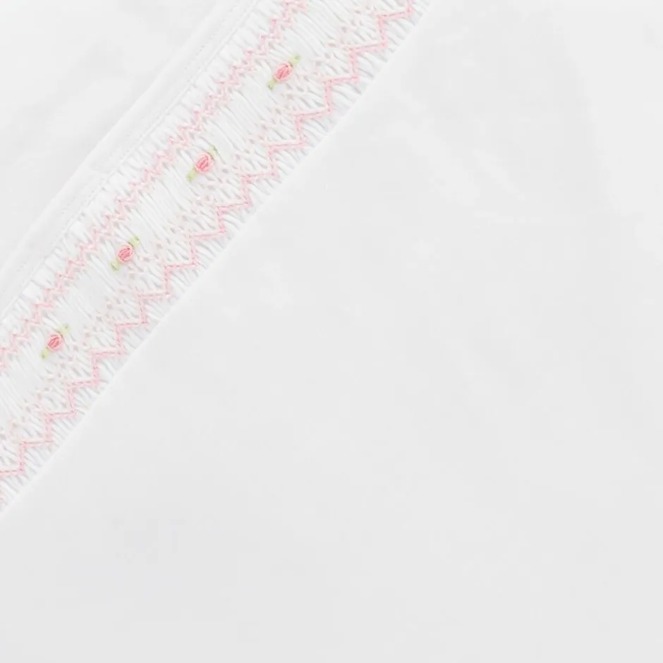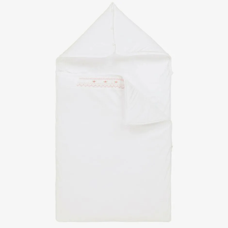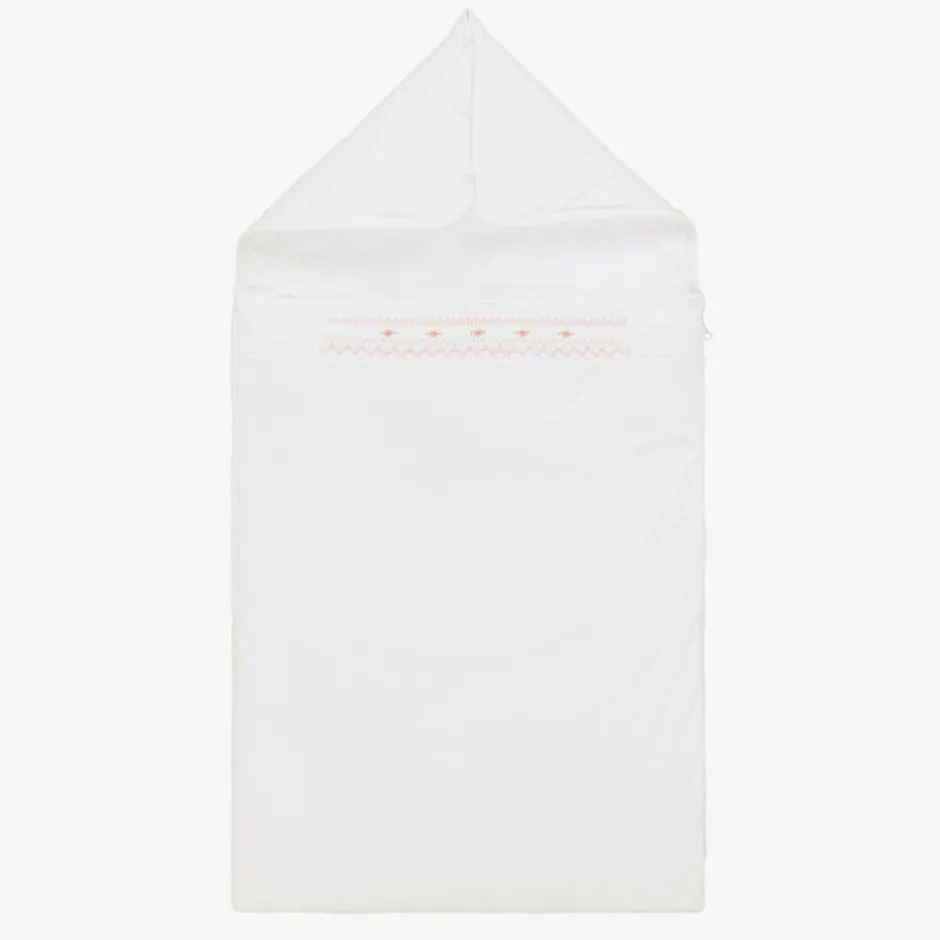 Exclusive to Childrensalon, a white nest for baby girls by Kissy Kissy, made in super soft Pima cotton jersey. Lightly padded for warmth, this cosy nest has a hand-smocked panel on the front with pretty pink floral hand embroidery. It has a zip fastening on one side and the popper fastenings on the hood can be opened to lay it flat.