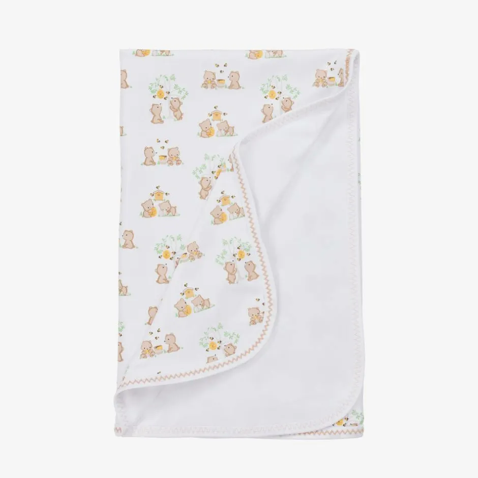 White blanket for baby boys and girls by Kissy Kissy, made in a double layer of soft and stretchy Pima cotton jersey. The front is patterned with the cutest little bear cubs and bee hives with beige picot trims. The reverse is plain white. This lovely accessory is ideal for use in the nursery or when out and about in the pram or car seat.
