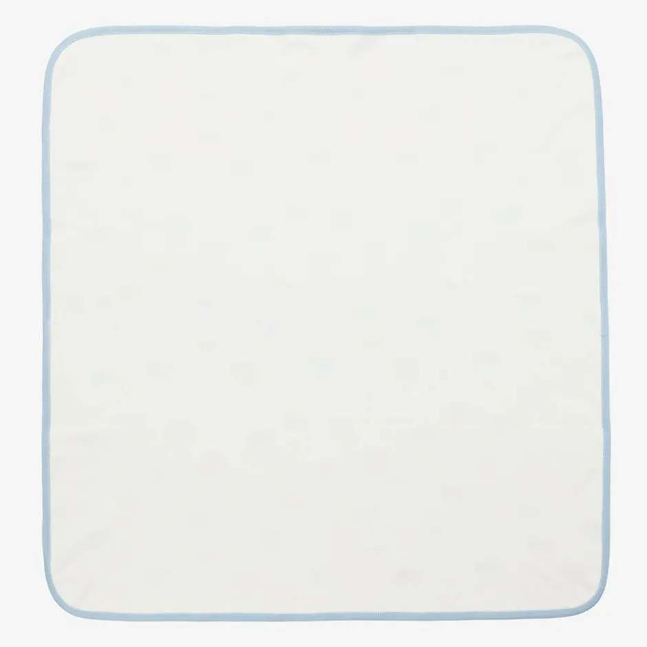 Super sweet, this ivory blanket for baby boys by Kissy Love is made from super soft Pima cotton jersey. It has a pale blue ribbed border and is printed with an adorable teddy bear pattern on one side. Gentle on delicate skin, it is ideal for use in the nursery or when out and about in the pram or car seat.