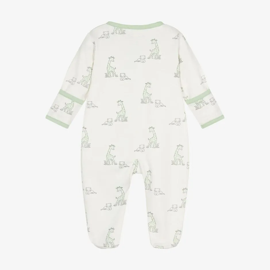 An ivory babygrow for boys and girls by Kissy Love, made from soft Pima cotton jersey. For an adorable look, it is printed with a cute giraffe and lion cub pattern, with light green trims. Fastening with a two-way zip on the front, it has a protective chin guard and fold over scratch mitts on smaller sizes.