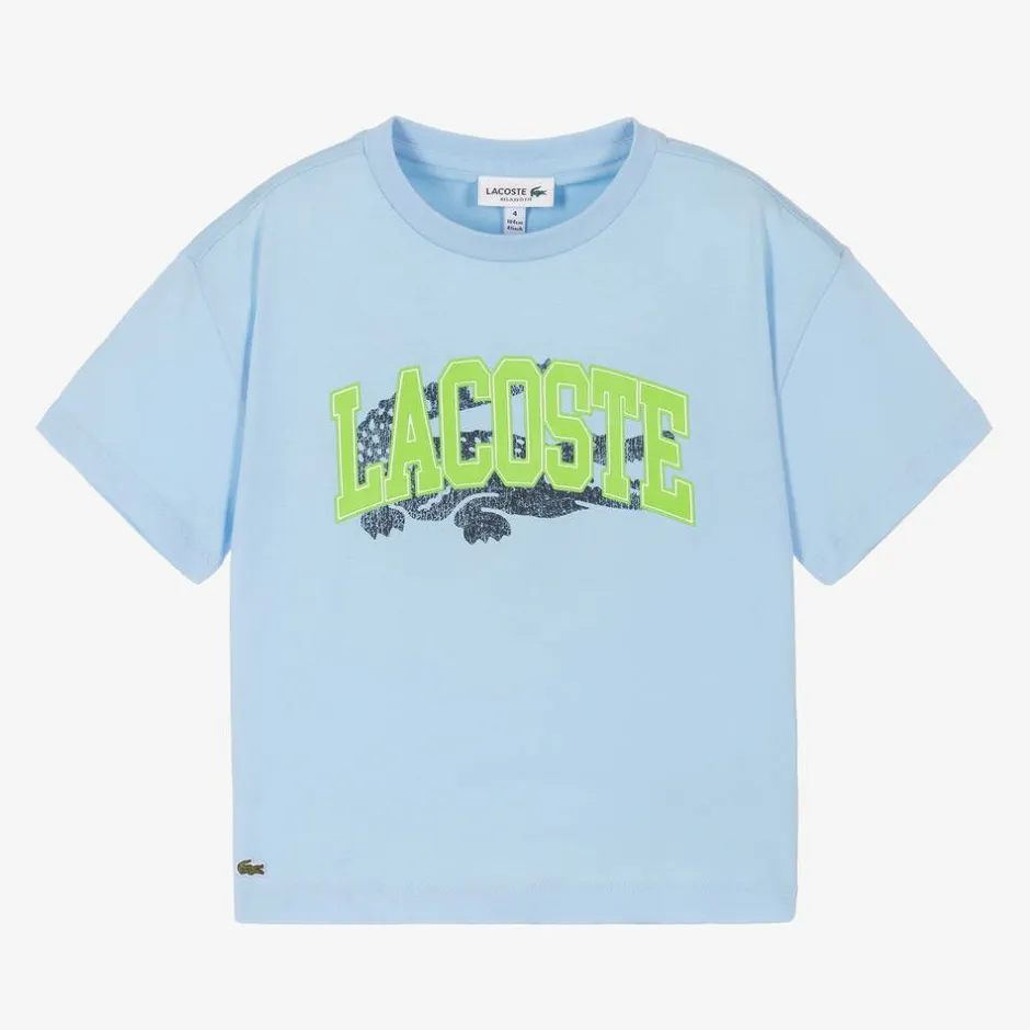 Pale blue cotton T-shirt for boys and girls by unmistakably by Lacoste. It has a large, green, varsity-style logo emblazoned across the front, with the brand's reimagined crocodile logo in distressed navy blue below. Made in super soft jersey, the T-shirt has a crew neck and the iconic embroidered green crocodile logo badge by the hemline.
