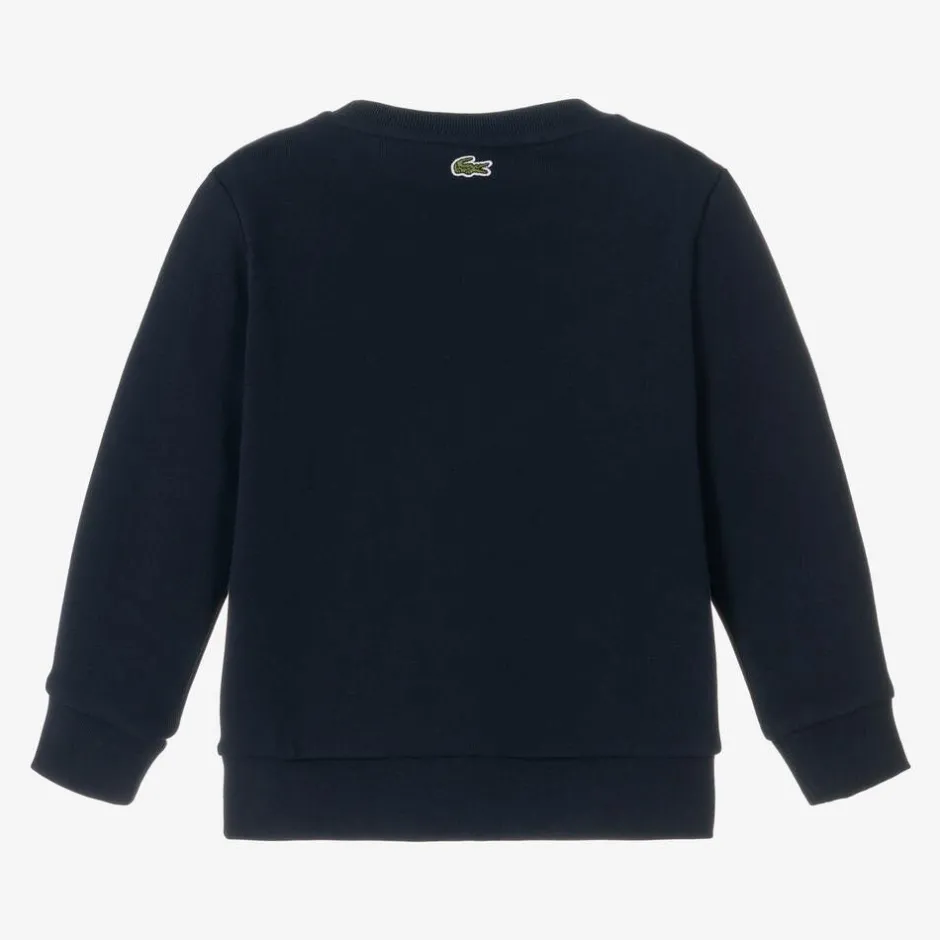 Navy blue sweatshirt for boys and girls by Lacoste, made in mid-weight organic cotton jersey. Combining comfort and style, this long-sleeved top has a casual crew neckline and comfortable ribbed detailing. The brand's iconic logo is printed on the front in white and a small green crocodile patch is stitched on the back for further designer detailing.
