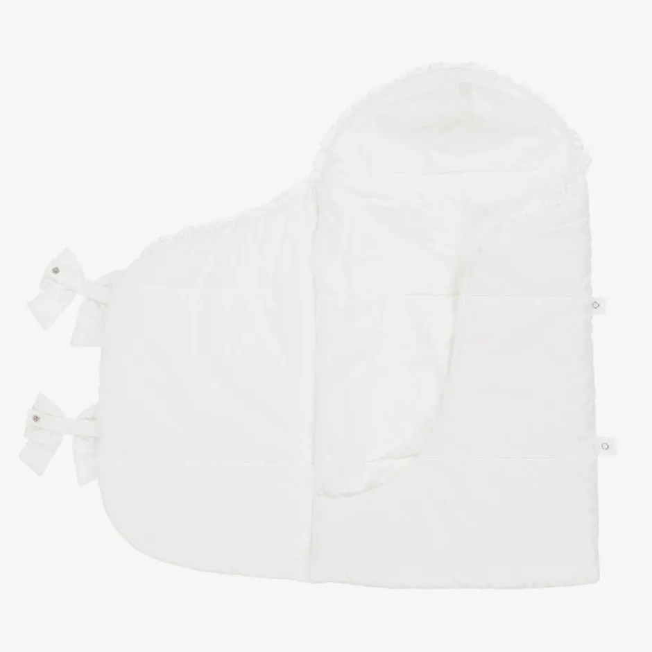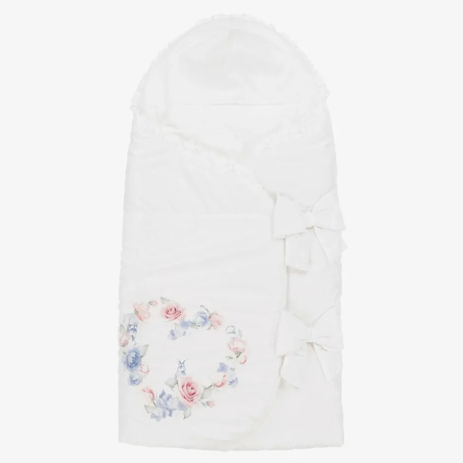 White silky satin nest for baby girls by Lapin House, with a beautiful pale pink and blue print of flowers, birds and bunnies. In a wrap-around style with frilly satin trims, it is warmly padded and lined in soft, comfortable cotton jersey. The nest has popper-fastening straps on one side, with pretty fixed bows on top.