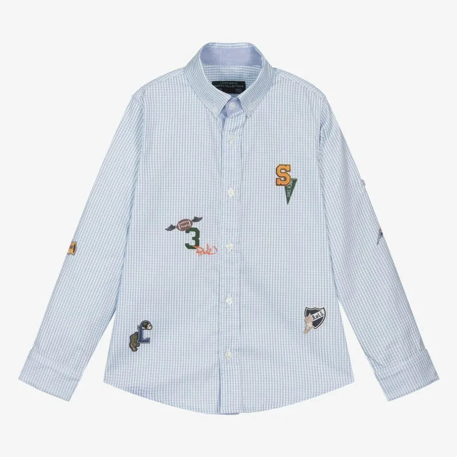 Smart-casual long-sleeved shirt for boys by Lapin House, made in lightweight cotton poplin. It is patterned with a blue and white check, with varsity sport logo prints for a fun finish. Cool and comfortable, it fastens with buttons on the front and the sleeves can be rolled up and secured with a button for warmer weather.