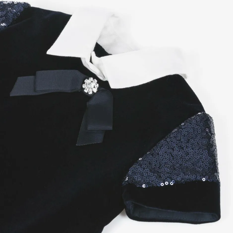 Navy blue velvet dress for girls from Lapin House, trimmed with sequins that shimmer beautifully in the light. Lovely for a special occasion, this smart dress has a contrasting white, twill collar and a grosgrain bow and crystal embellishment on the neckline. It is fully lined in lightweight cotton for comfort and fastens neatly on the back with a concealed zip and single button.