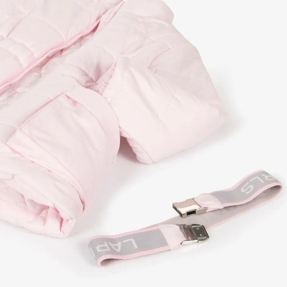 Pale pink puffer coat for girls by Lapin House, with cosy, mid-weight padding. Beautifully soft and warm, it has a useful, removable hood secured with buttons to keep chilly weather out, along with wrist inserts. For brand recognition, the front zip has a silver diamanté logo pull tab and the detachable, elasticated belt has repeat jacquard logos. The coat has front pockets and a quilted lining for comfort.