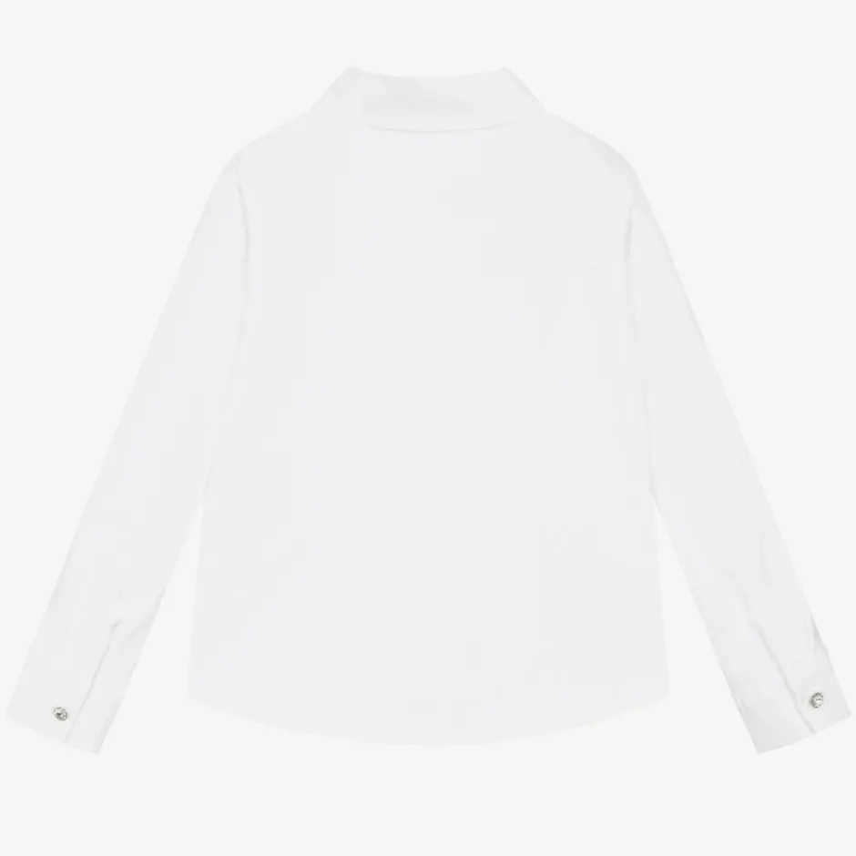 Smart white cotton blouse for girls by Lapin House, made in soft cotton poplin with a slight stretch for comfort. Adding an elegant touch to a classic style, the pointed collar is embellished with sparkling silver, pink and faux pearl beads. There are concealed button fastenings on the front, with a glistening crystal-effect button on the cuffs and neckline completing the stylish look.