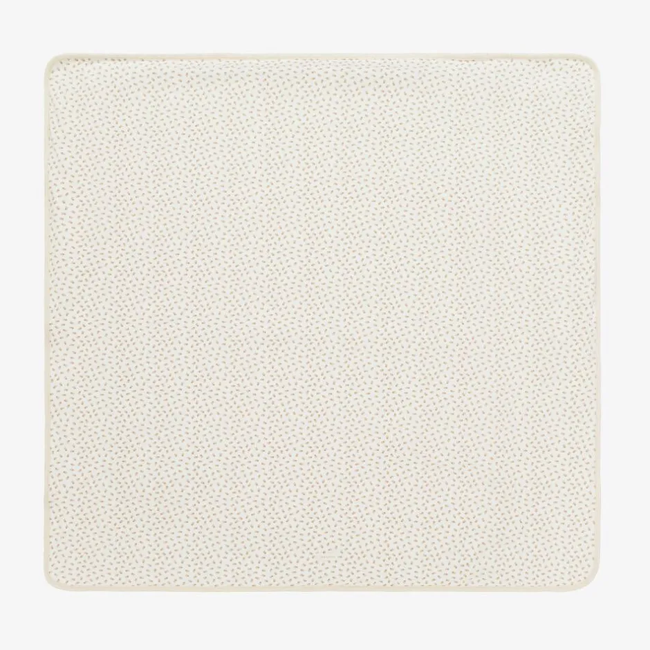 Ivory organic cotton blanket for girls by Portuguese brand Laranjinha, with a sweet, stylised floral print in beige. Made in soft, stretchy jersey, it is trimmed in beige, with a coordinating, ribbed velour lining. It is ideal for both the nursery and for when out and about in the pram or car.
