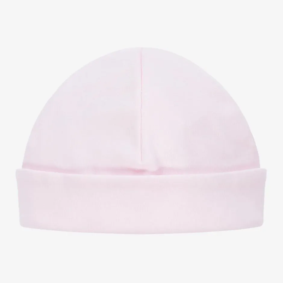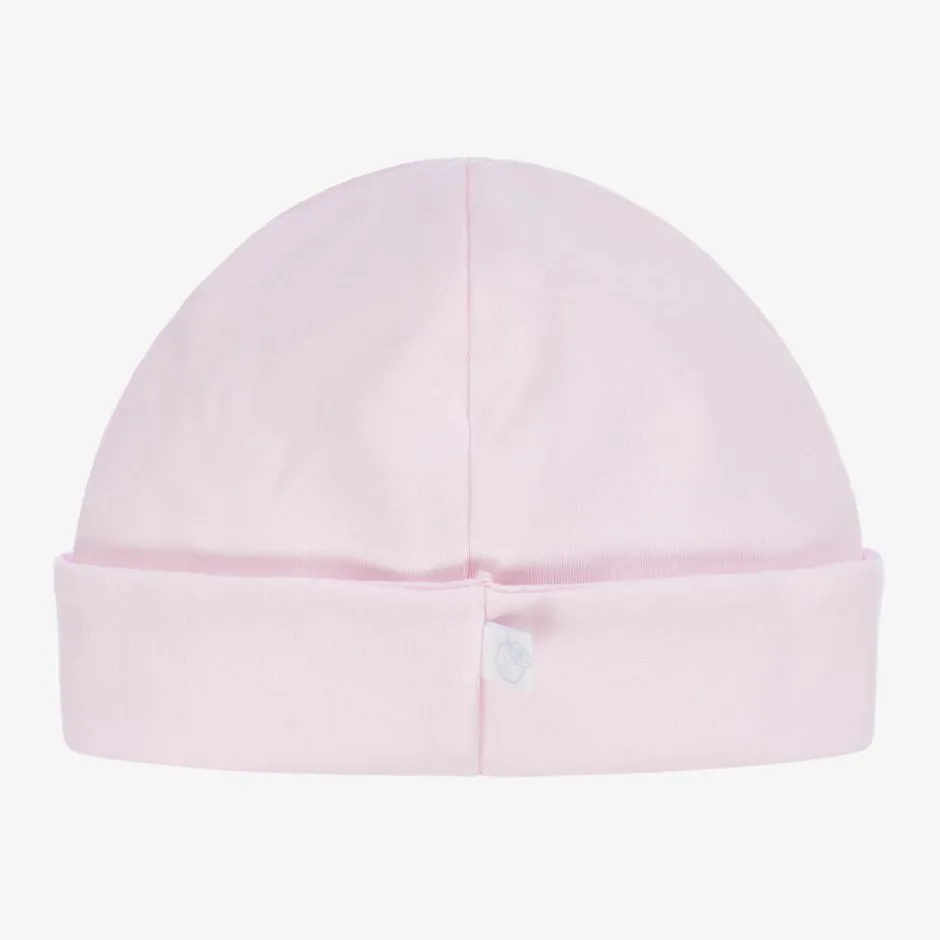Lovely pale pink layette hat for baby girls, by Laranjinha. Ideal for tiny babies delicate skin, it is made in luxuriously soft cotton jersey and has a sweet turned-up brim with a logo tab on the side.