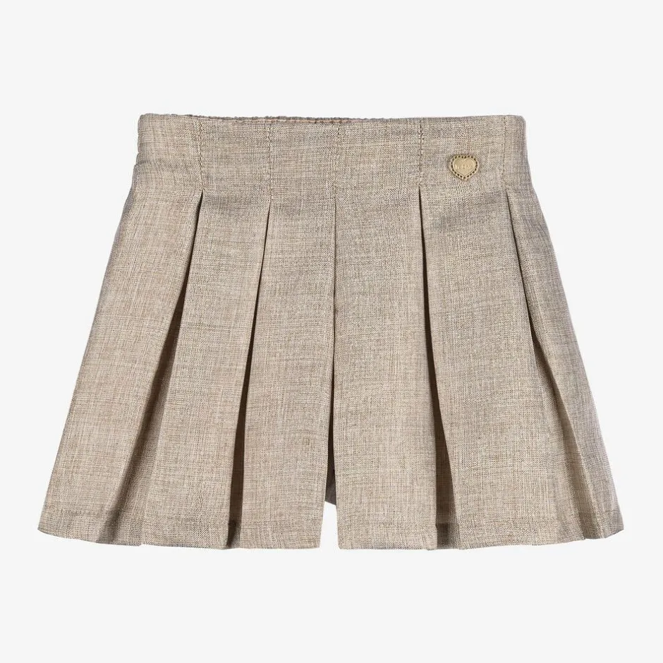 Beige special occasion shorts for girls by Le Chic, shimmering with gold thread. Pleated and lined in soft satin, they have a semi-elasticated waistband for a comfortable fit. Easy to wear, they simply pull up.