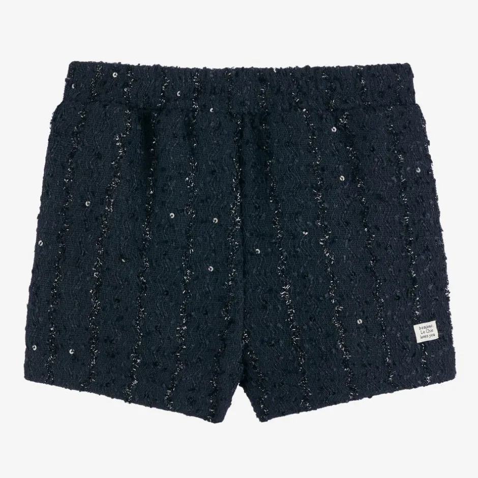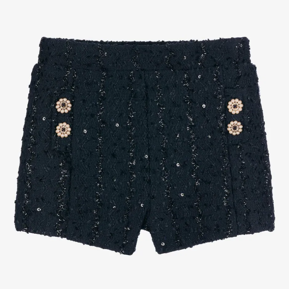 Smart navy blue shorts for girls by Le Chic, ideal for a special occasion. Patterned with wavy, fringed lines of shiny thread and scattered sequins that catch the light beautifully, they have stylish pearl bead and diamanté faux buttons on the front. For comfort, there is a satin lining and a semi-elasticated waistband. Easy to wear, they simply pull up.