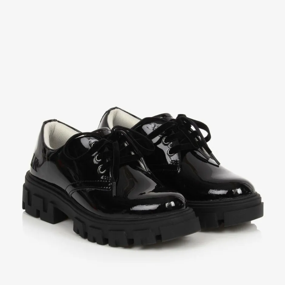Chunky black shoes for girls by Lelli Kelly, made in patent leather with a lovely shine. Ideal for school, they are lined in soft fabric and have a supportive, cushioned insole which can be removed. The rubberised outer sole has oversized, deep ridges for a contemporary look and helps provide extra grip. They fasten with stylish black velvet laces and come with a spare pair of plain black laces for an alternative look.