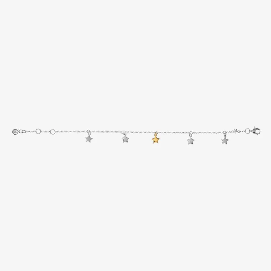Delicate and dainty, this sterling silver bracelet for girls is by Little Star. Fastening neatly with a clasp, the adjustable chain is decorated with enchanting star-shaped charms, including one that is gold-plated for a sweet finish. Made to cherish, it is presented in a lovely drawstring pouch and box and comes with a Little Star gift bag, ideal for celebratory and special occasions.