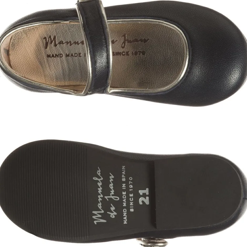 Girls navy blue ballerina pumps with gold trims by Manuela de Juan, handmade in soft leather. In a pretty Mary Jane style, they have a soft leather lining, popper fastening and a rubber sole.