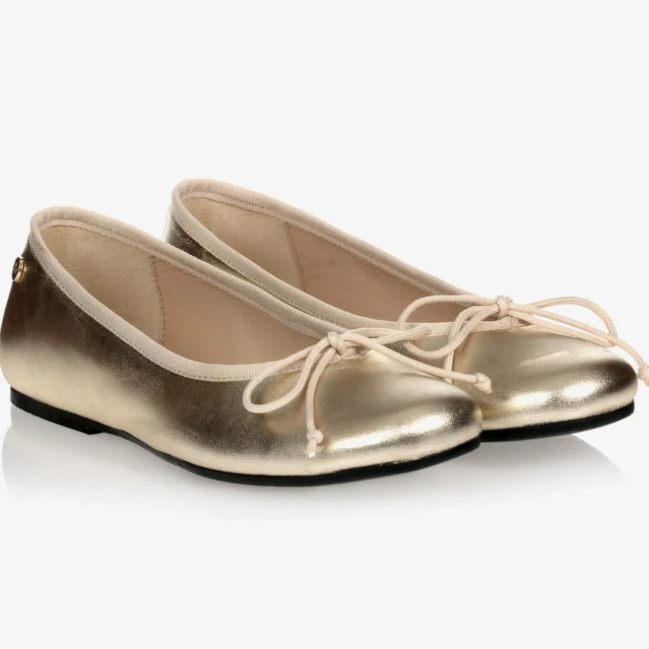 Girls elegant metallic gold ballerina flats by Manuela de Juan. Handmade in soft leather with bow details, they have ivory trims around the openings. They are lined in soft leather and have rubber outsoles.