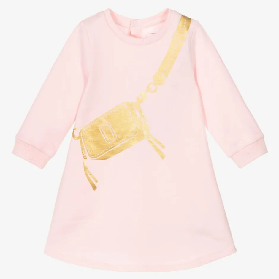 Comfortable and stylish for little girls, this pastel pink sweatshirt dress from MARC JACOBS is made in mid-weight cotton jersey. It has a gentle A-line shape, ribbed trims and a cosy fleece feel against the skin. Popper fastenings on the back help with over-the-head dressing. Adding an unmistakable designer touch, it has the American brand's iconic Snapshot bag printed in a shiny gold trompe-l'oeil design across the front. Ideal as a gift, smaller sizes come with a branded box.