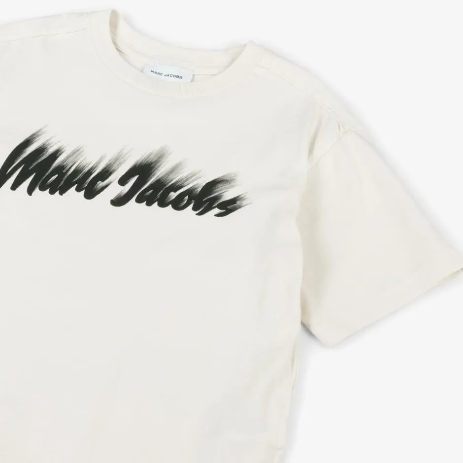 Light beige T-shirt for boys and girls by MARC JACOBS, made in soft organic cotton jersey. Casual and comfortable, this cool top has raw edges on the seams and a black smudged logo on the front for a statement designer finish.