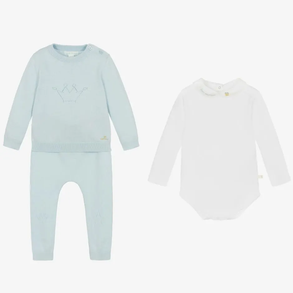 Lovely pale blue knitted trouser gift set for baby boys designed by the Greek princess Marie-Chantal. It is made in a luxuriously soft cotton and cashmere blend with cosy ribbed trims. The sweater has a cutwork crown on the front, with a shiny gold logo embroidered by the hemline and fastens with useful logo buttons on one shoulder. The trousers have a matching crown and star on the knees and a faux drawstring on the elasticated waistband, just right for little tummies. They come with a super soft Pima cotton jersey bodysuit, with a poplin Peter Pan collar that is beautifully embroidered with 'Home Sweet Home' and a little house in yellow and blue.
