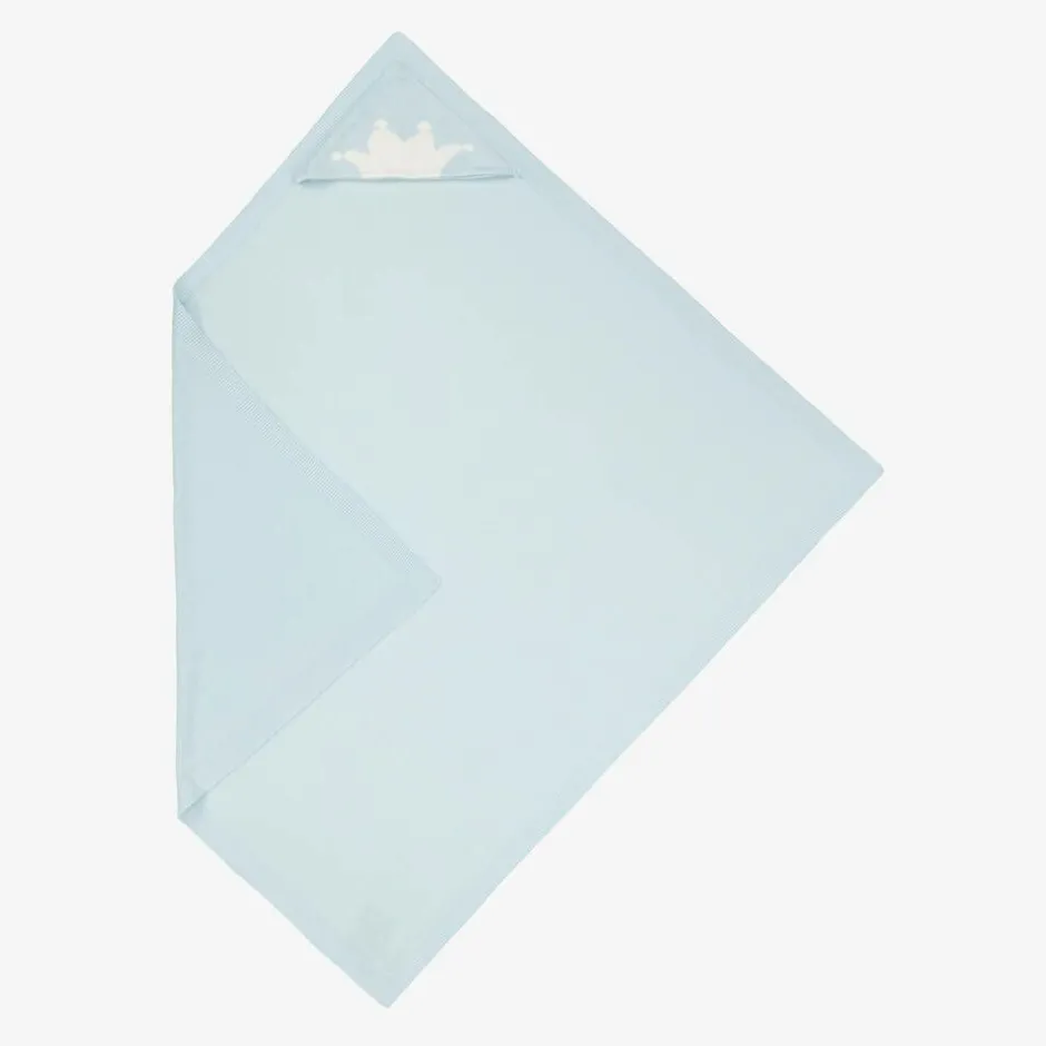 Pale blue blanket for baby boys and girls by Marie-Chantal, with the designer's signature Tino Crown motif on the hood. Knitted in a luxuriously soft cotton and cashmere blend, this lovely blanket is ideal for wrapping baby and keeping them cosy and warm.