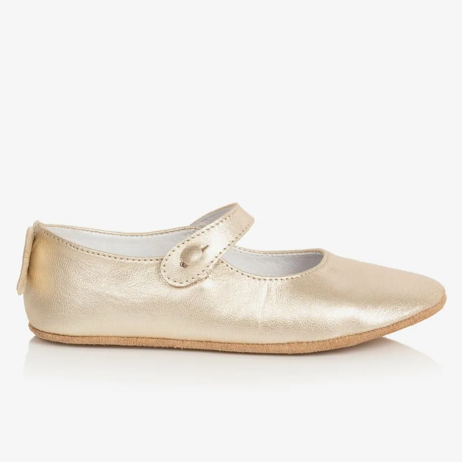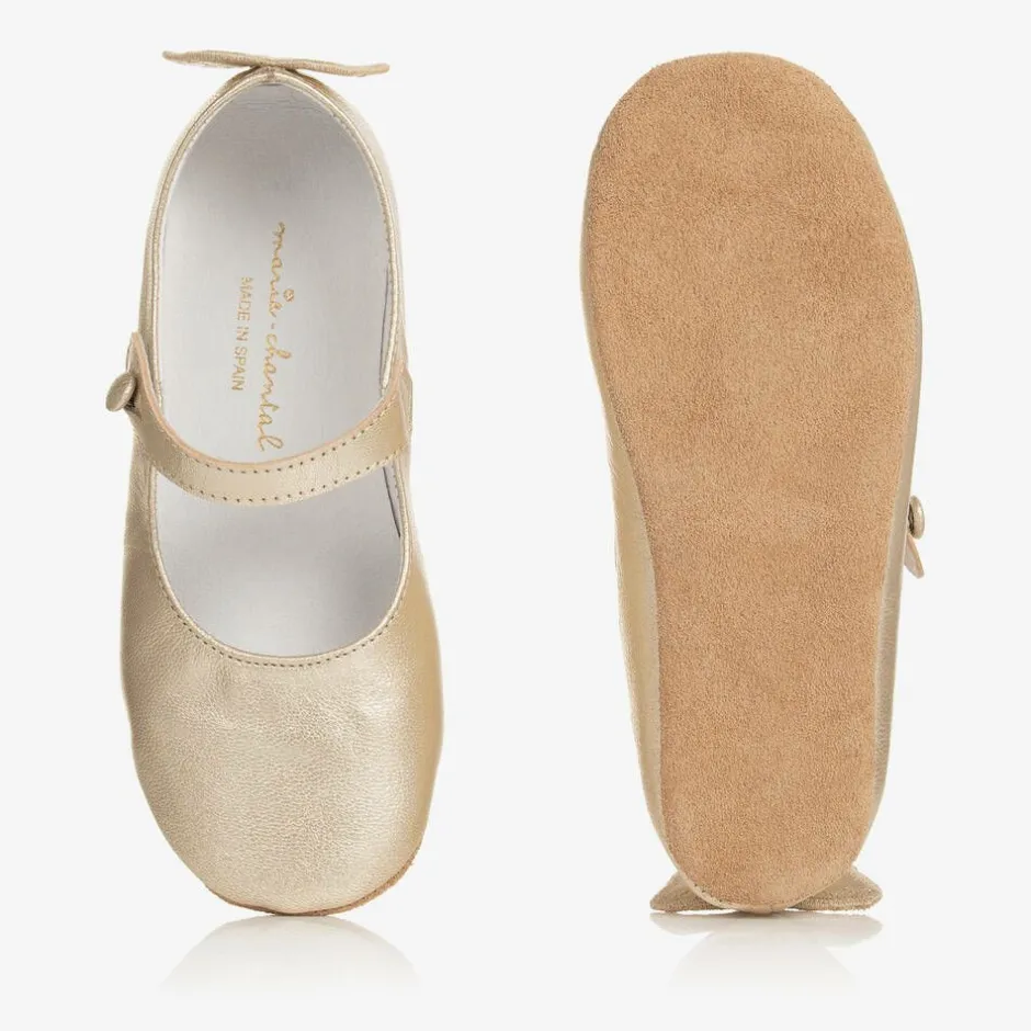 In a lovely shade of pale gold, these classic Mary Jane shoes for girls are by Marie-Chantal. They are made in luxuriously smooth leather with suede leather soles, and trimmed with the designer's signature Angels Wings at the back. Lightweight and comfortable, they secure on the foot with a button fastening strap.