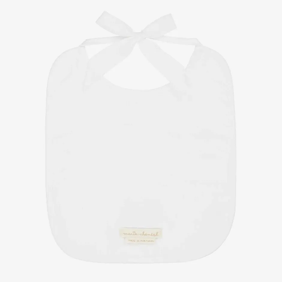 Lovely white bib for baby boys and girls by Marie-Chantal, made in soft cotton. The front is made in towelling and cotton sateen, with the brand's heritage crest embroidered in ivory. It is lined in soft cotton and has a popper fastening on the back with a pretty bow.