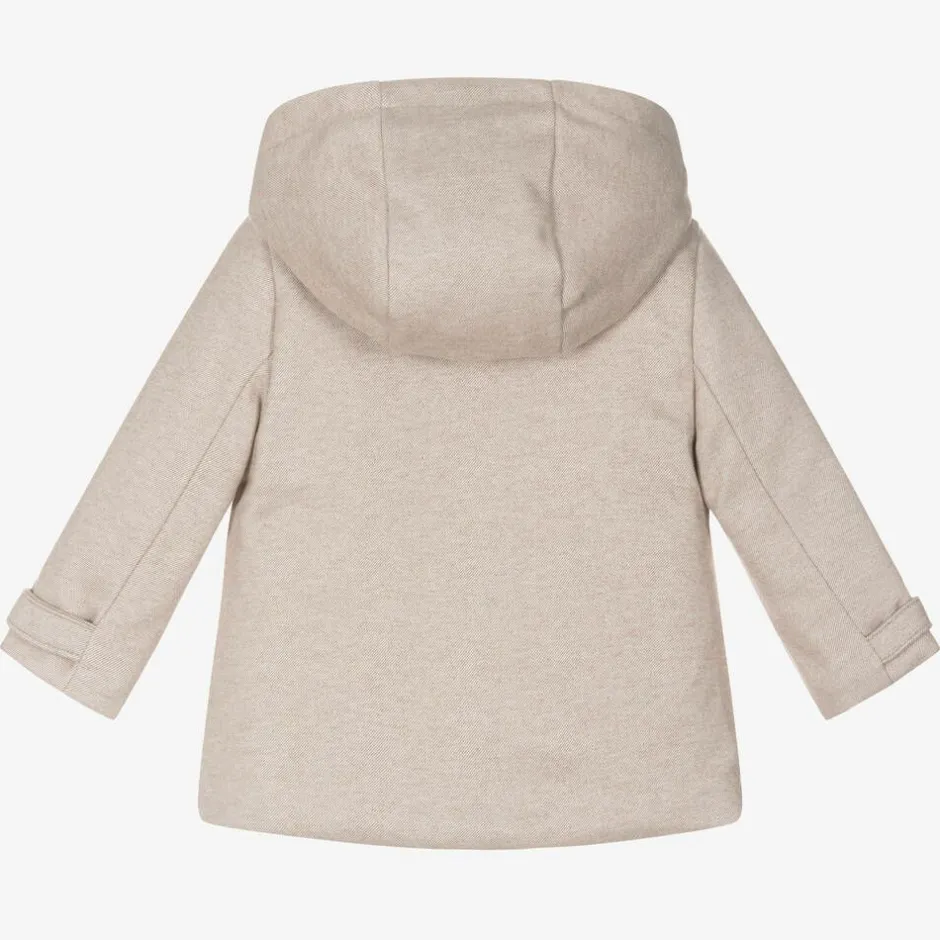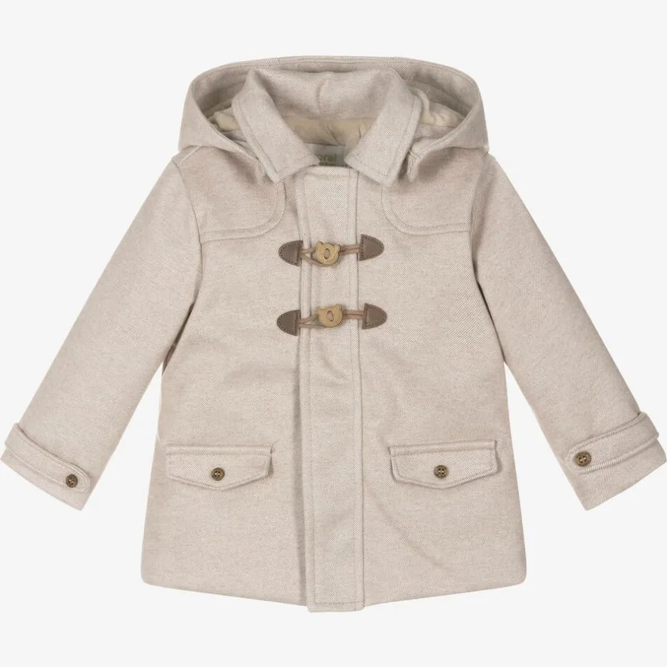Made from soft brushed twill, this beige duffle coat for baby boys is by Mayoral. Lined in cosy velour, this lightly padded coat has a hood that detaches with a zip for a different look. It has faux pocket details on the front and a concealed zip and popper fastening, with teddy-bear-shaped toggles for a cute finish. This item contains recycled fibres.