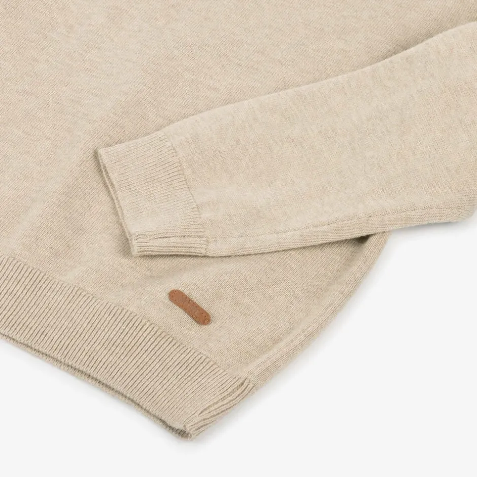 Beige cotton sweater for boys by Spanish brand Mayoral, finely knitted in soft cotton. Great for layering, this lightweight top has comfortable ribbed trims and a faux leather logo patch sewn by the hemline.