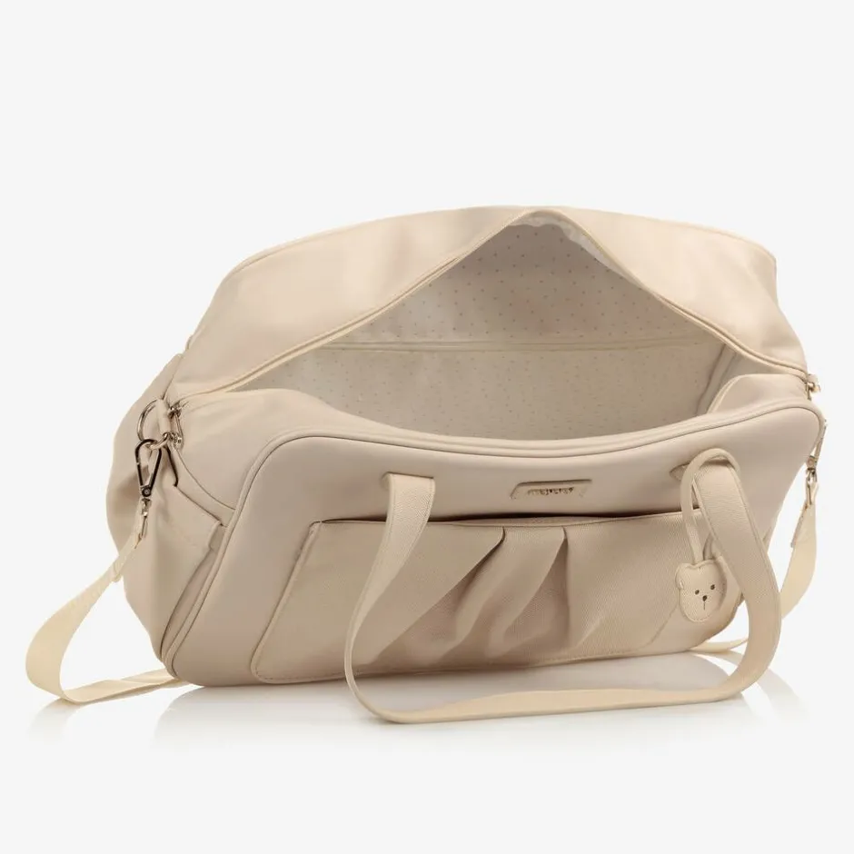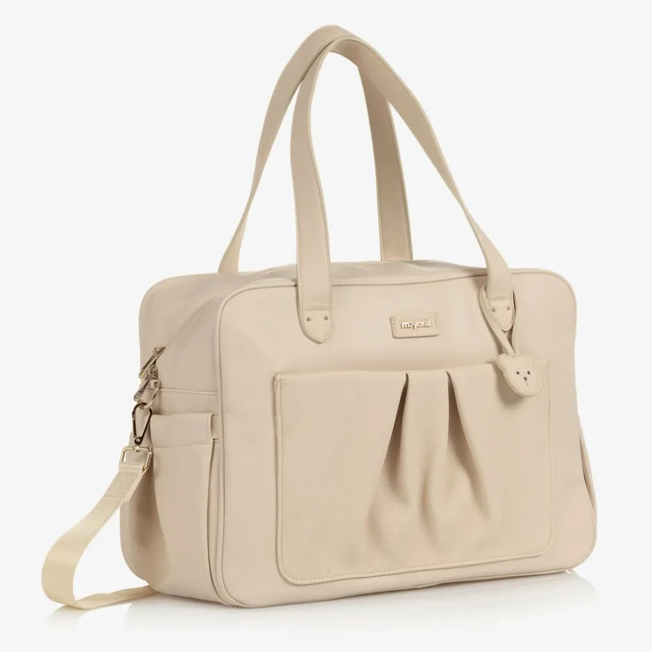 Beige faux leather changing bag by Mayoral, with golden metal hardware and a cute teddy bear charm. Soft yet sturdy, it has a ruched popper-closing outer pocket and logo patch above, both made in soft canvas-effect fabric for an interesting multi-textural finish. This versatile bag can be carried with the detachable shoulder strap, stored on the stroller using the buggy straps, or held with the carry handles. Lined with soft twill, there are handy interior and exterior pockets for storing baby essentials.