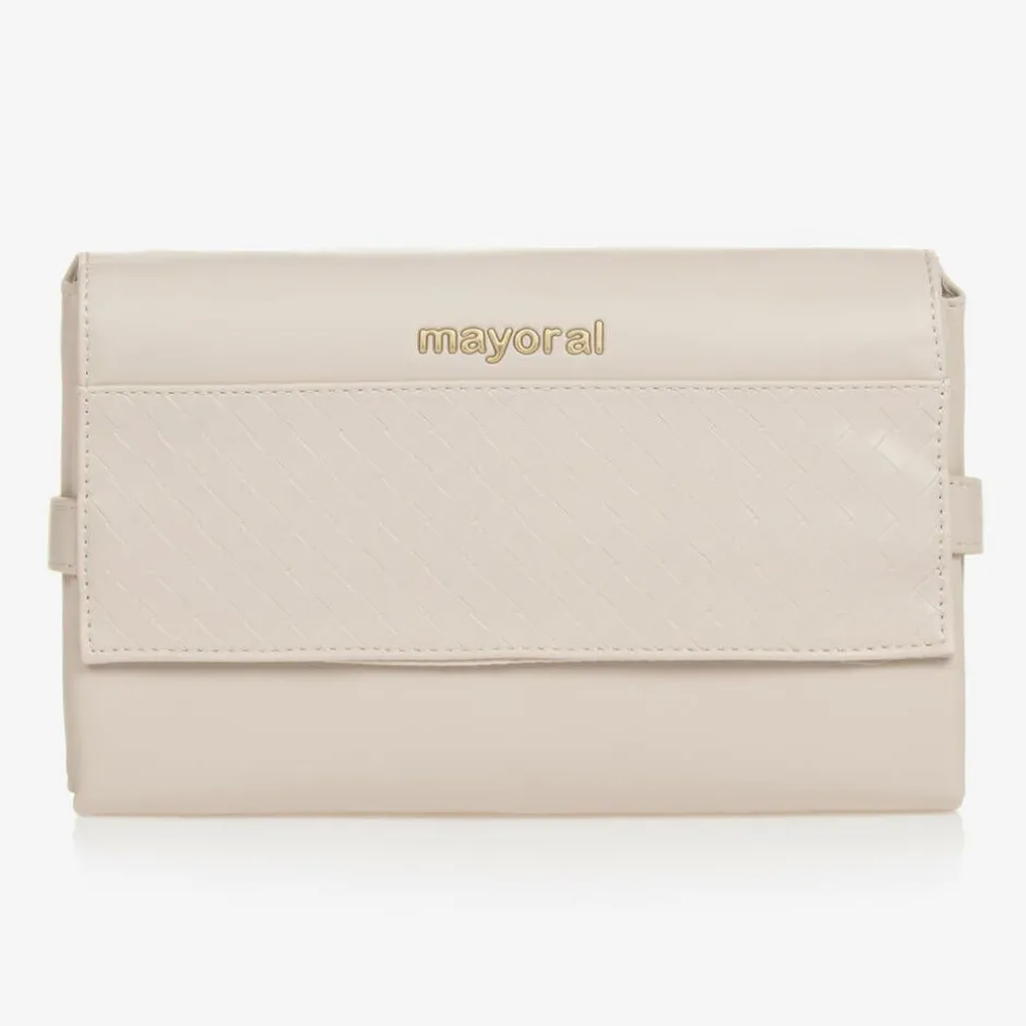 Lovely beige foldable changing mat for baby boys and girls by Mayoral. Fastening with velcro on both sides, it is made in soft faux leather with a silky lining and light padding for baby's comfort. Lightweight and practical on the go, it folds up easily into a compact size to slip into a buggy pocket or a changing bag and has a zipped back for pocket. The front flap has an embossed weave pattern and a golden logo branding.
