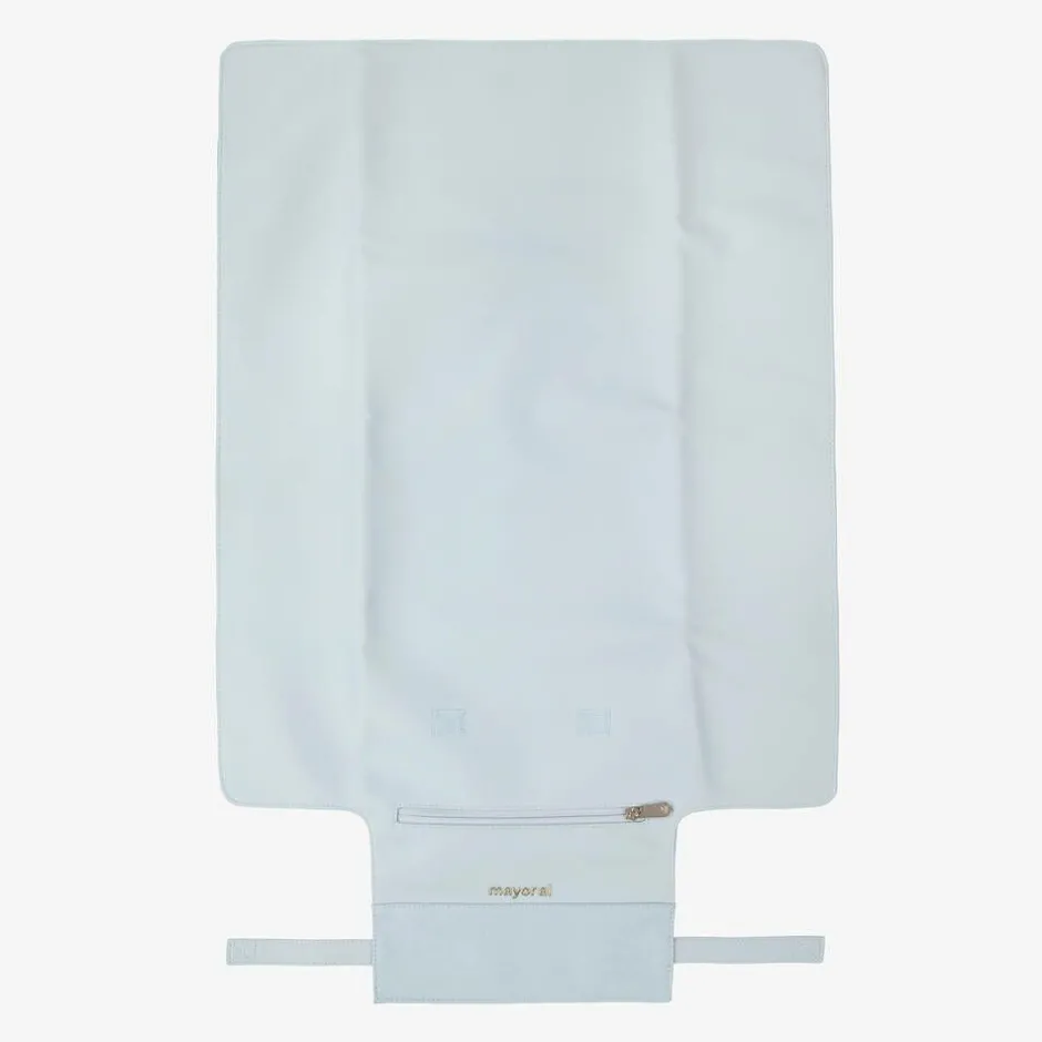 Lovely pale blue foldable changing mat for baby boys and girls by Mayoral. Fastening with velcro on both sides, it is made in soft faux leather with a silky lining and light padding for baby's comfort. Lightweight and practical on the go, it folds up easily into a compact size to slip into a buggy pocket or a changing bag and has a zipped back for pocket. The front flap has an embossed weave pattern and a golden logo branding.