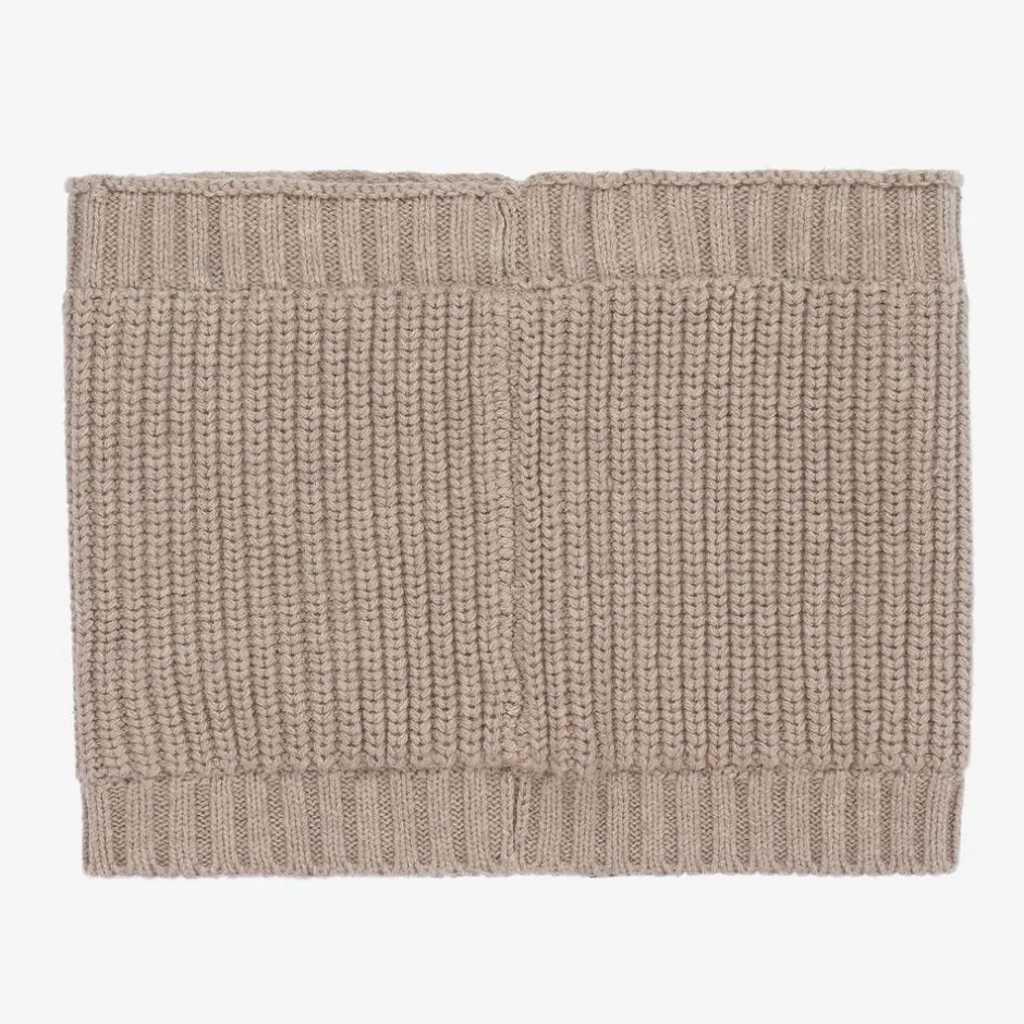 Beige snood for boys by Mayoral, knitted in soft cotton in a mid-weight ribbed design. Cosy and comfortable, it has a warm polar fleece lining, ribbed trims and a navy blue 'Make It Fun' tab on the front.