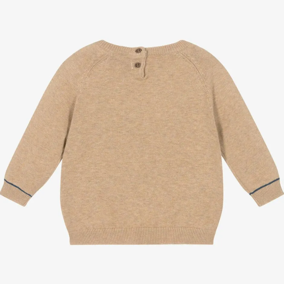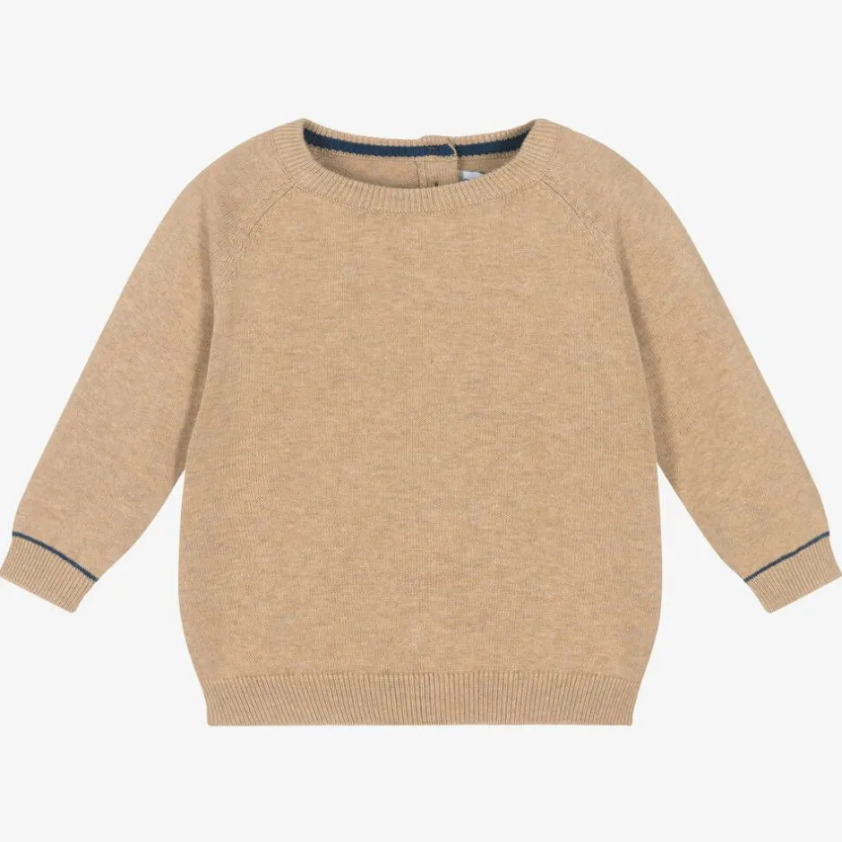 A timeless classic, this simple beige cotton sweater for little boys is by Mayoral. Made from a soft knit with ribbed trims, it has a fine navy blue stripe around the cuffs and button fastenings on the back for a neat finish.