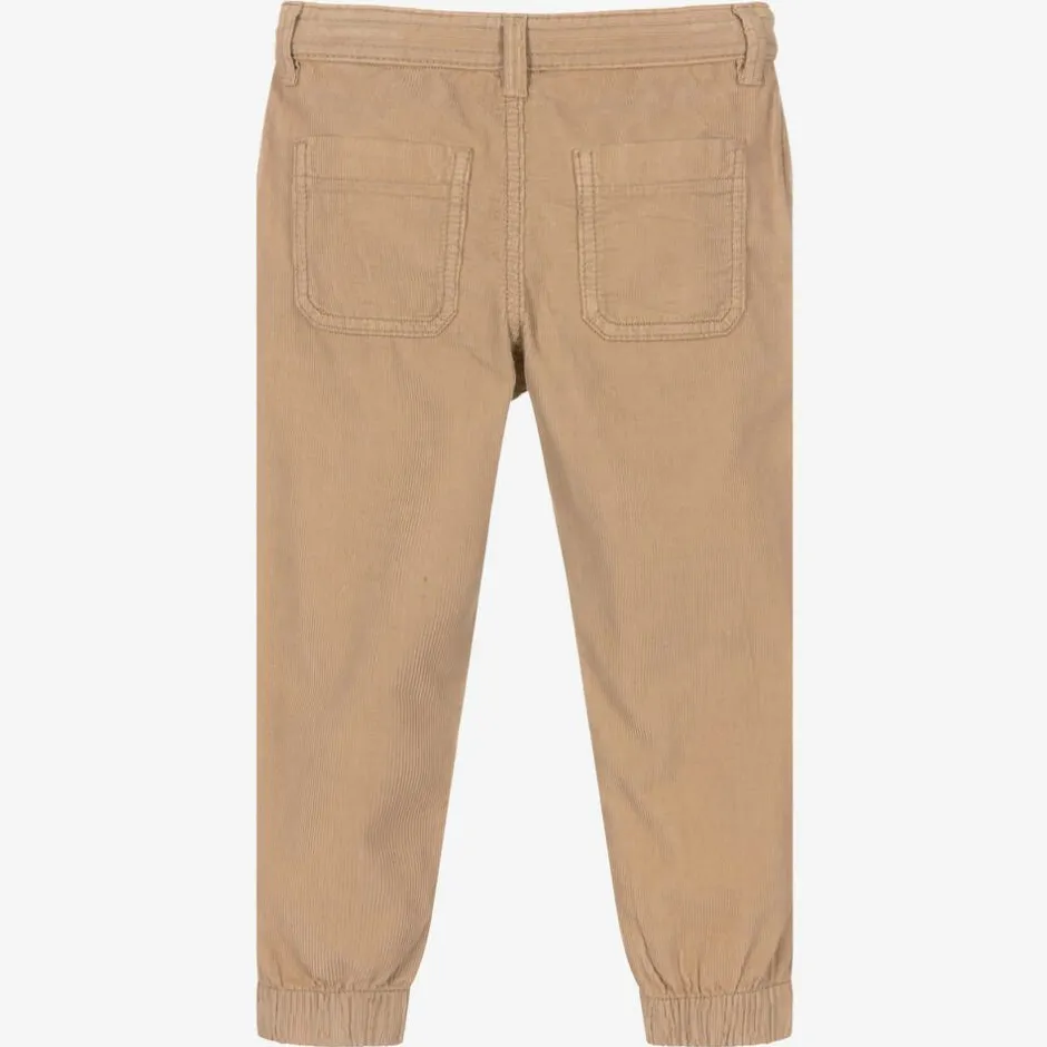 Dark beige trousers for boys by Spanish brand Mayoral, made from fine needlecord. Soft to the touch, these skater-fit bottoms have slanted pockets on the hips and patch pockets on the back. They fasten with a button on the front and have an adjustable waist for a preferred fit.