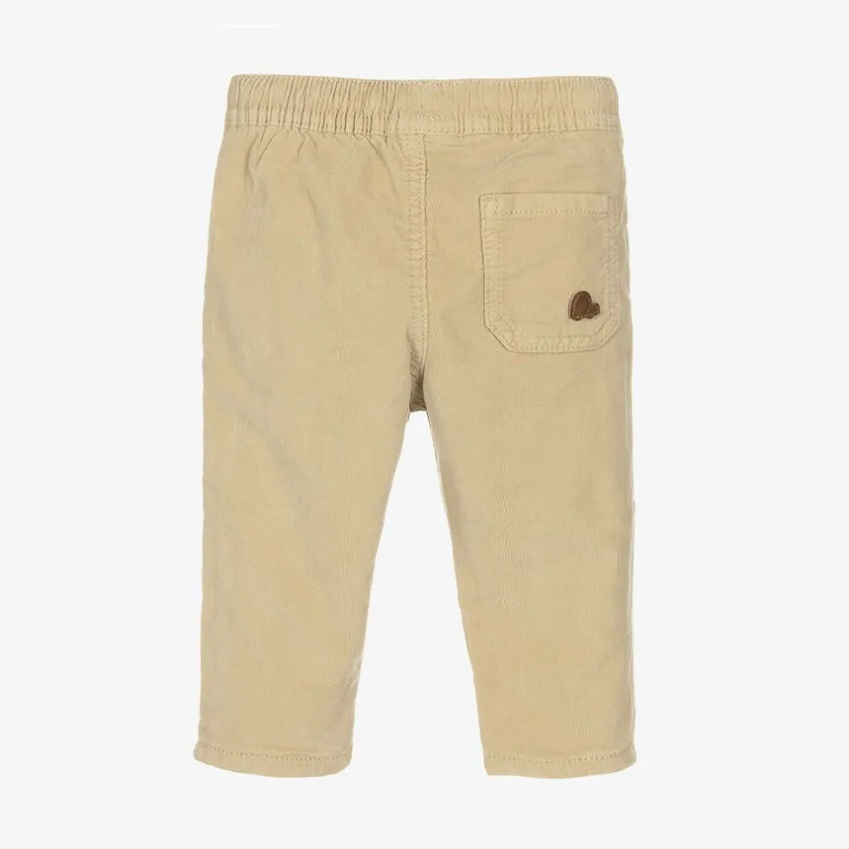Beige cotton trousers for little boys by Mayoral, made in finely ribbed needlecord with a touch of stretch. Easy for little ones to wear, they have an elasticated waistband with functioning drawstring ties. They are fully lined with check fabric and they have an adorable car motif stitched on the back pocket.